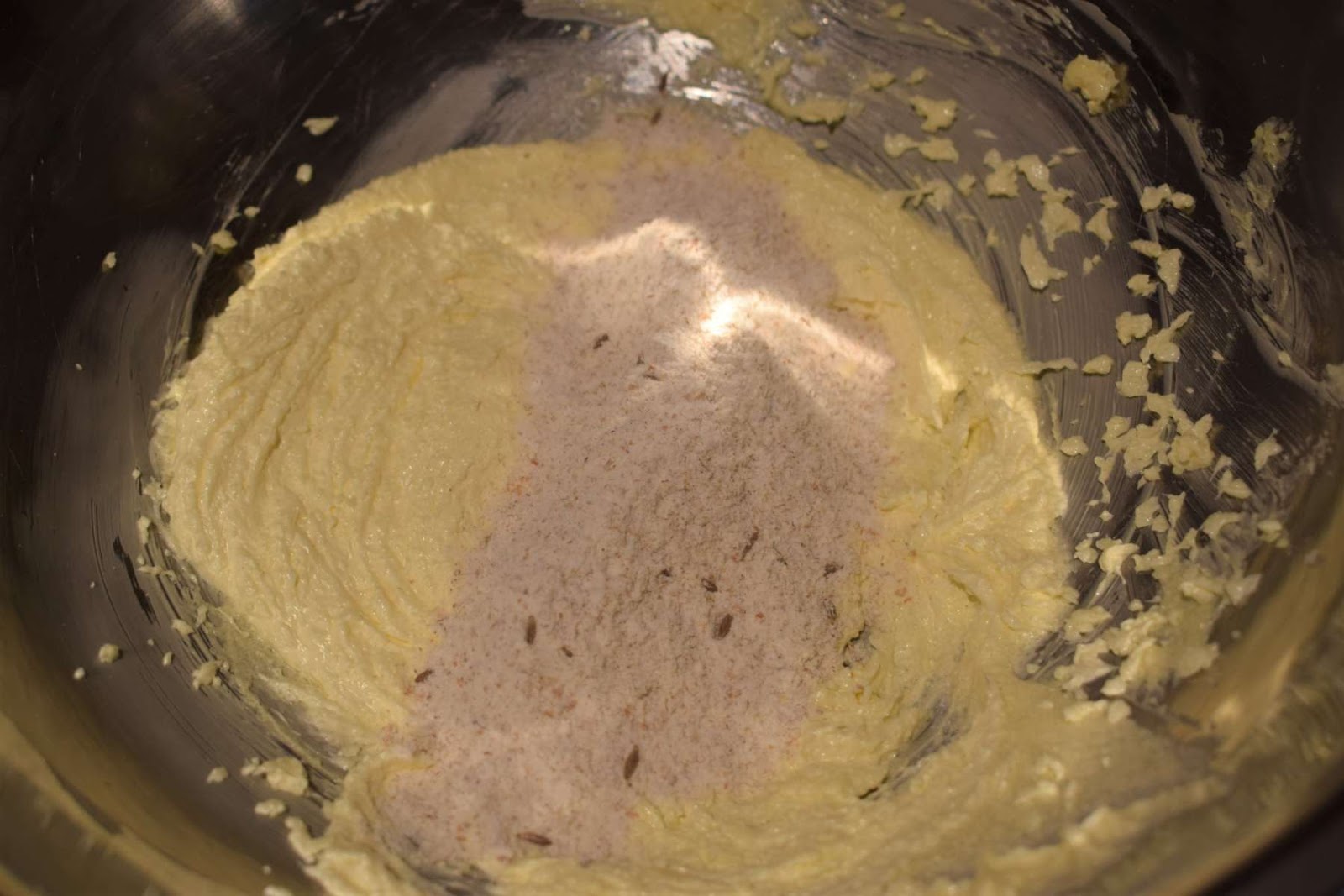 On the other hand, to prepare the Jeera Biscuit recipe, I have taken Butter and Sugar together in another mixing bowl. I have mixed both the ingredients with the help of a hand mixer in medium speed until it turns creamy and smooth.