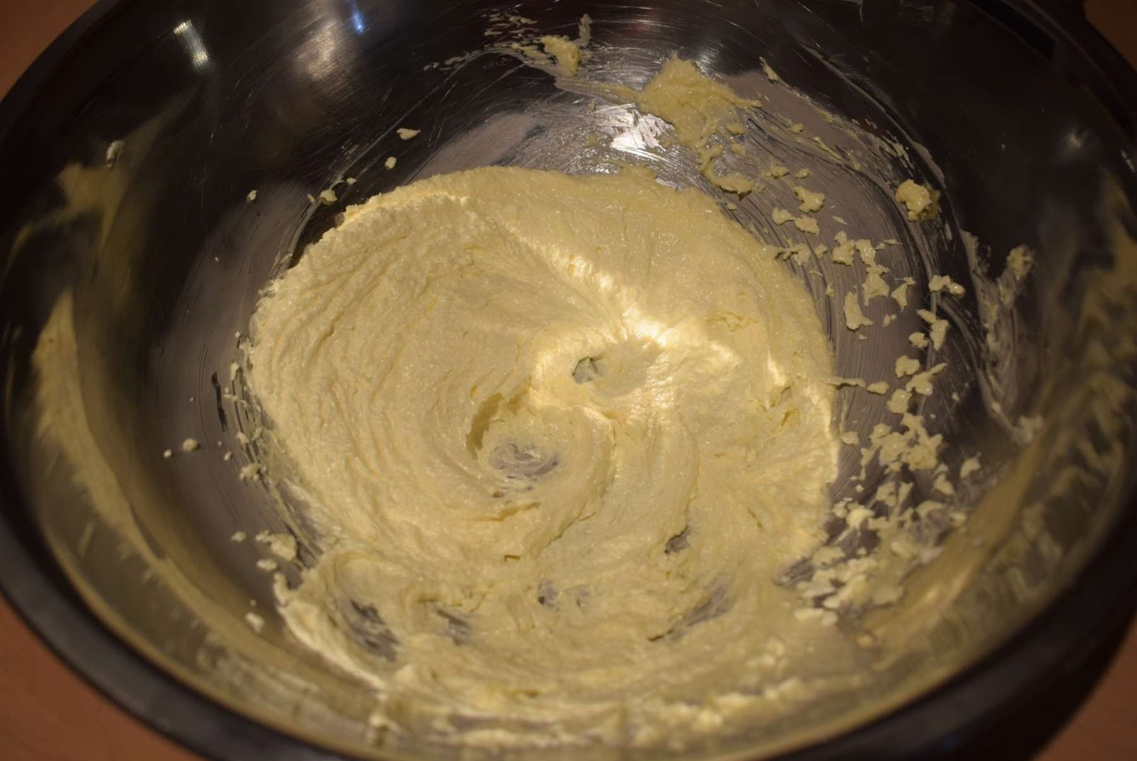 - Pour the Caster Sugar into the mixing bowl and mix it with the help of a hand mixer. Mix all the ingredients evenly in medium speed till it becomes smooth and creamy. Scrap the sides and bottom with the help of a spatula when required.