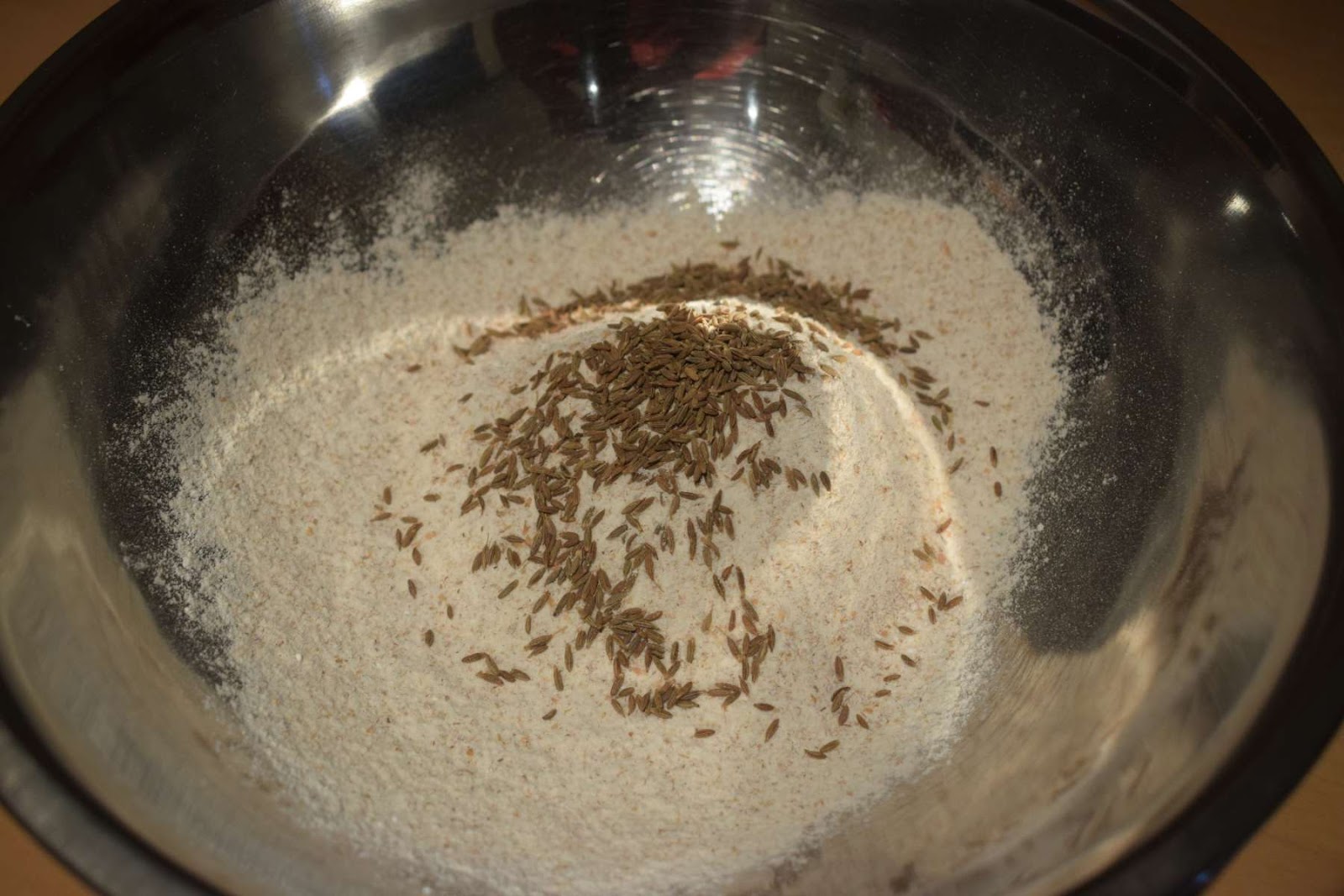 Then I have taken a large mixing bowl and sieved Wheat flour, Salt and Baking powder. Then I have added the roasted Cumin seeds into the mixing bowl. I have mixed all the ingredients with the help of a spoon and kept it aside.