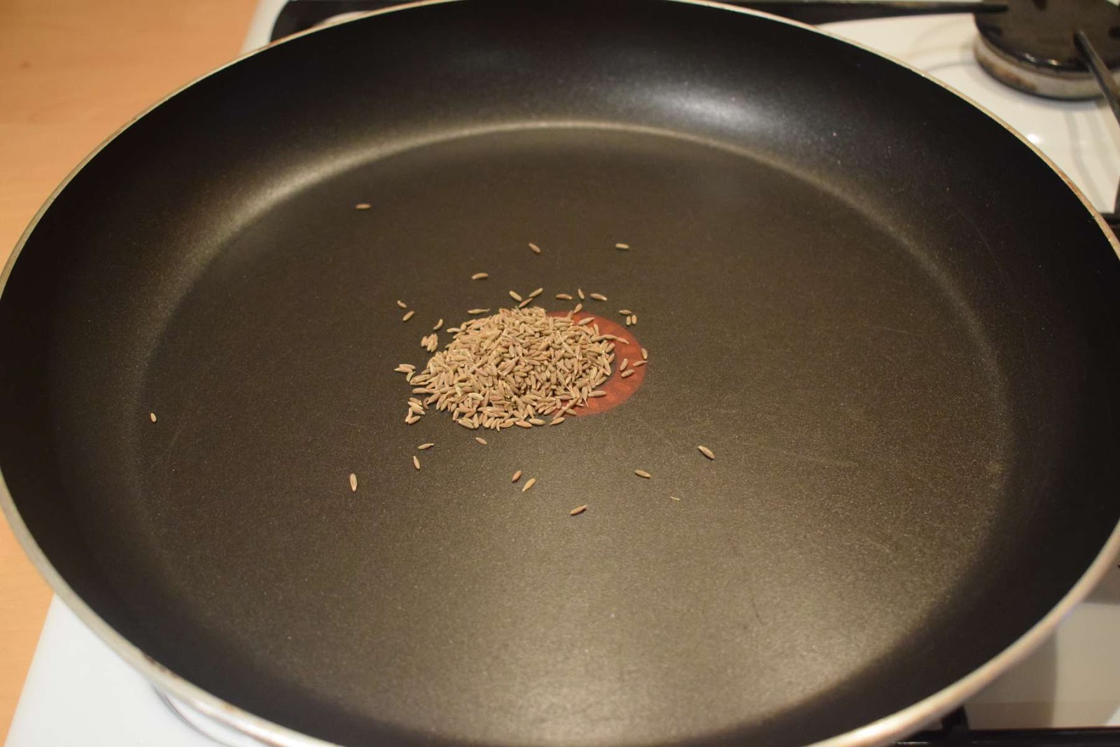 - Add Cumin seeds into the pan and dry roast it in medium low flame for 3-4 minutes until the Cumin seeds change the colour slightly. Stir the Cumin seeds continuously with the help of a wooden spatula.