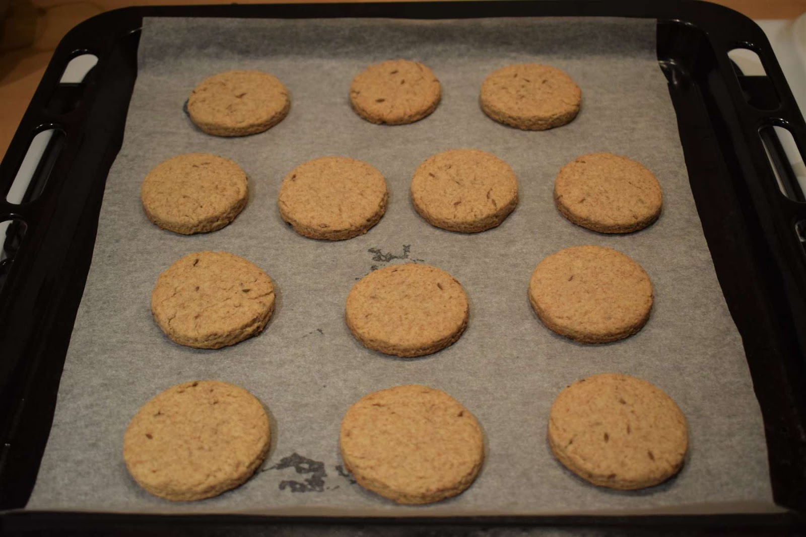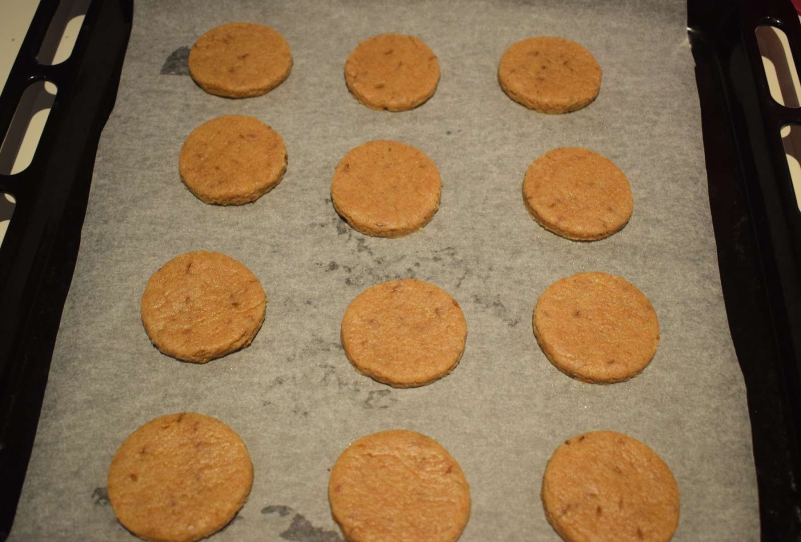 After this, I preheated the oven and lined the baking tray with wax paper before baking the zeera biscuits. I have baked the biscuits in the middle of the oven for 12-18 minutes.