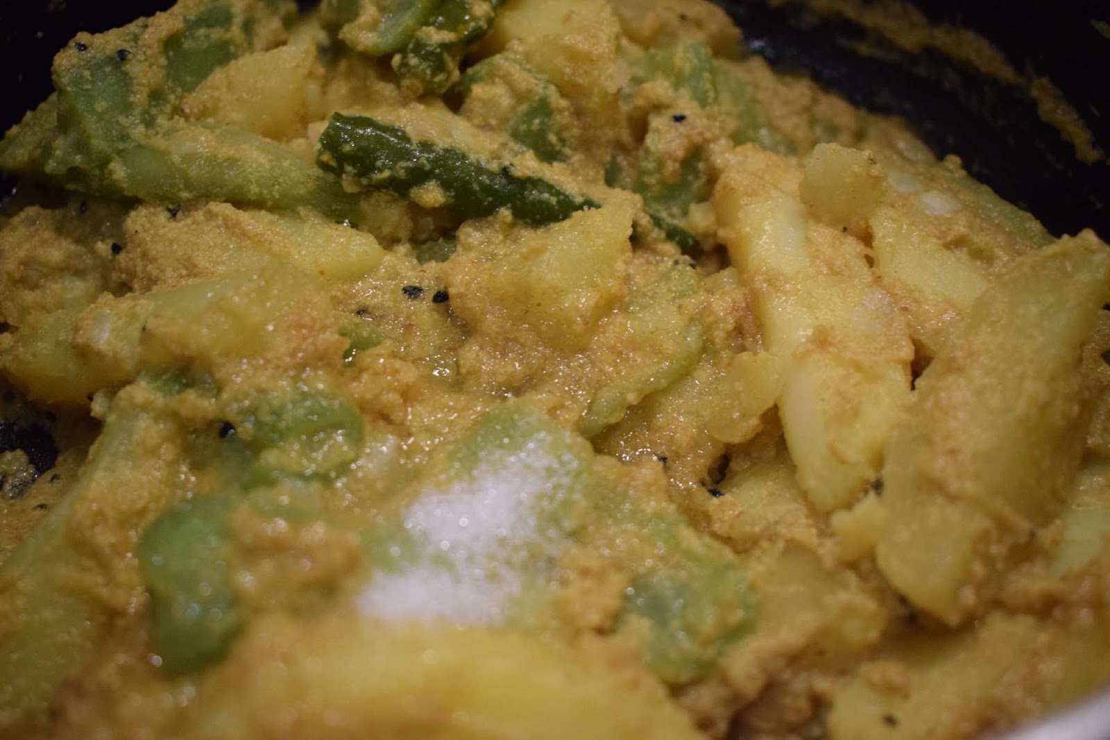 I have used Sugar in this recipe because Jhinge Aloo Posto tastes best when it has a tinge of sweetness added to it. The combination of hot green Chillies and Sugar makes the dish tastes divine.