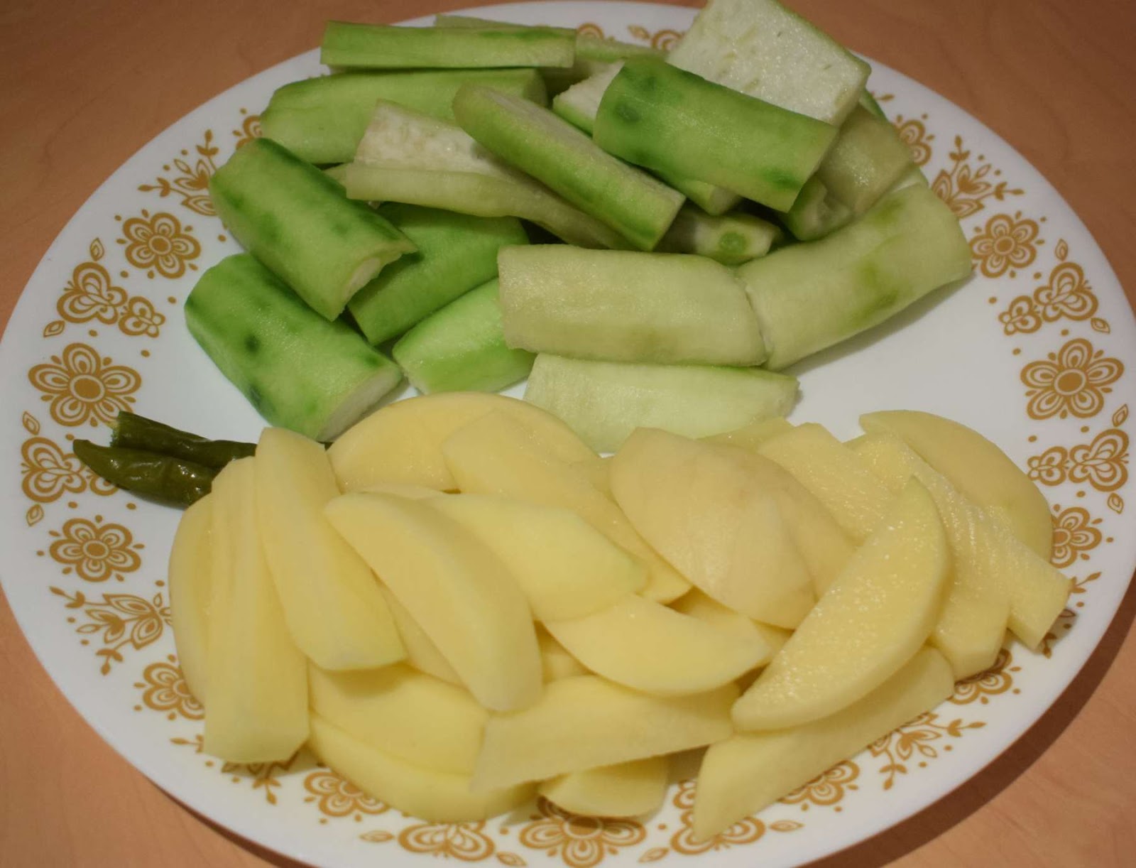 To prepare the Jhinge-Aloo Posto, I have peeled and cut the ridge gourds and potatoes in wedges. It gives better texture to the dish.