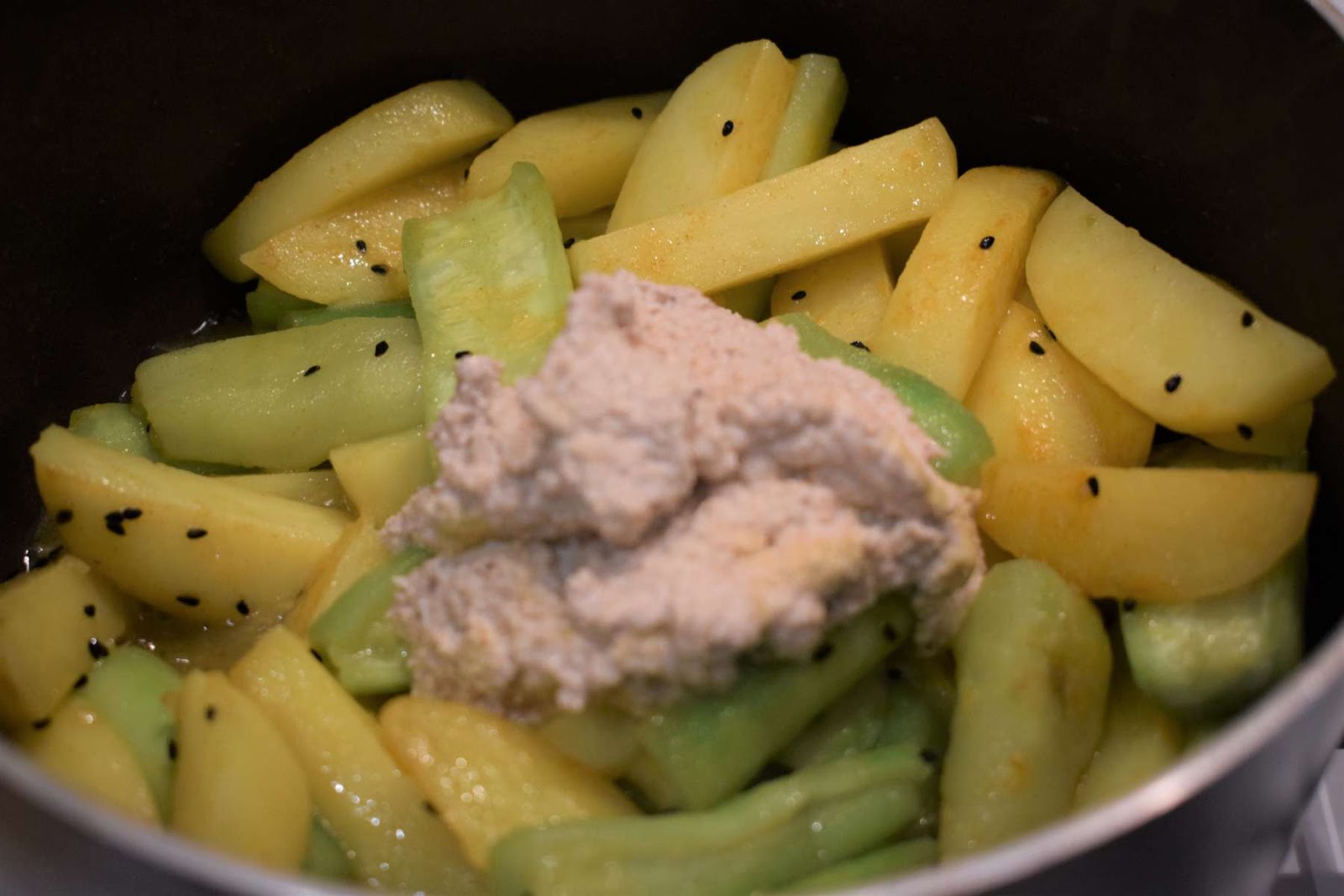 - Add the Poppy seeds paste (Step 1) and mix it nicely.