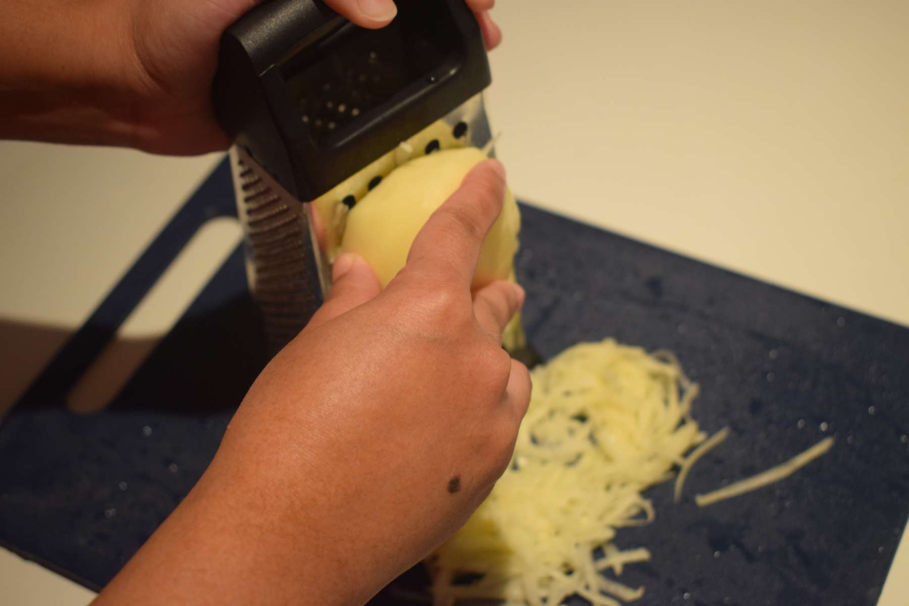 - Grate the potatoes with the help of a grater machine. Grate them from up to downward motion and repeat the process. Don’t grate them in opposite direction or else some tiny pieces of potatoes would get created.