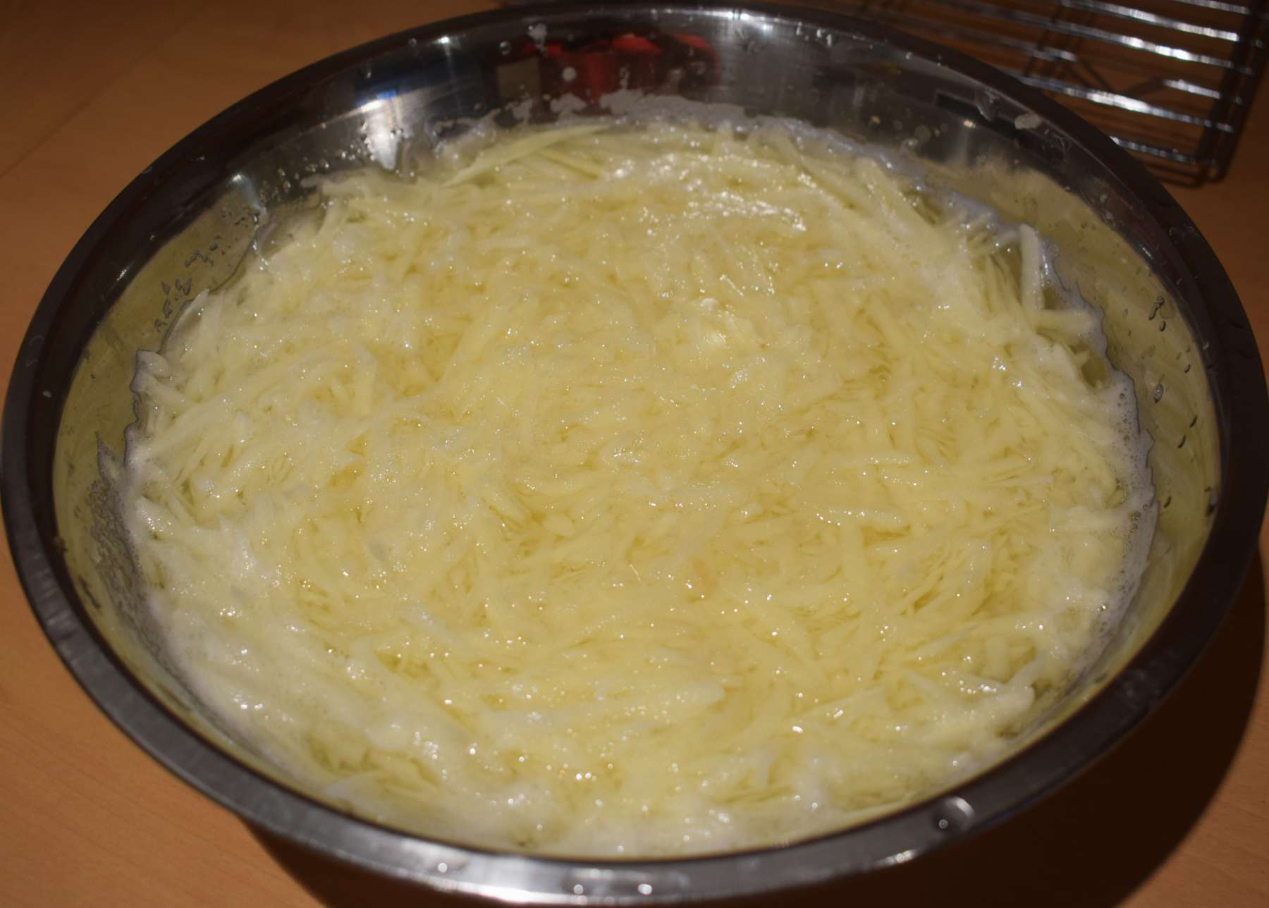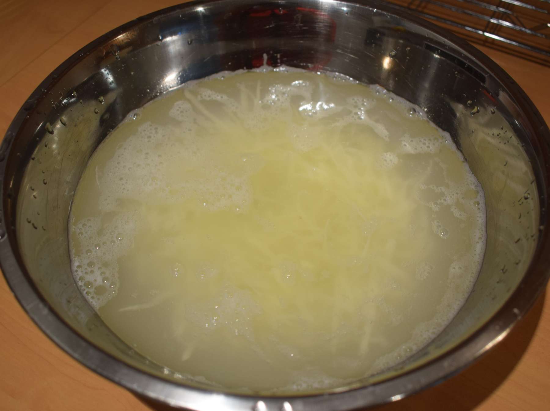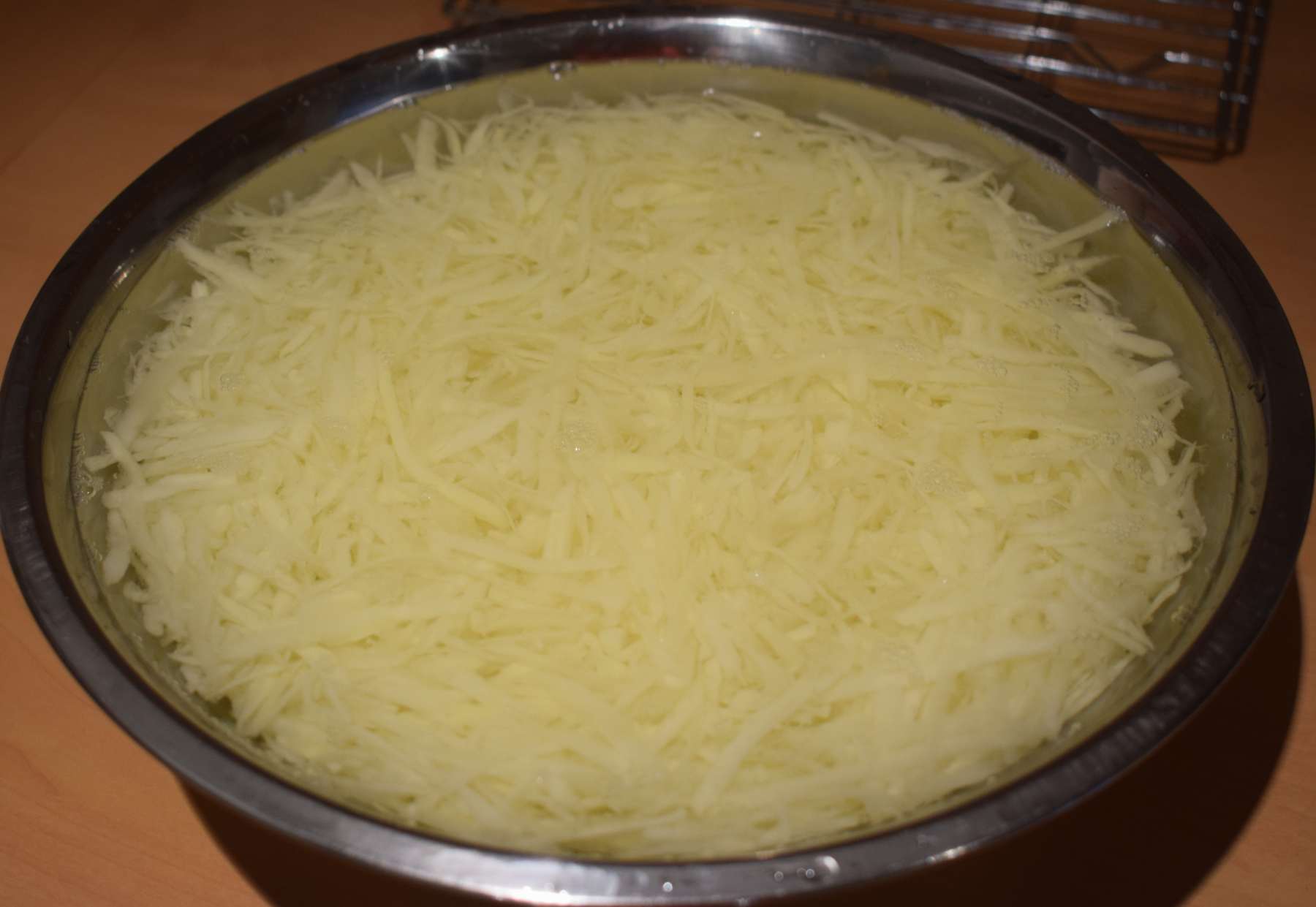 - Wash the grated potatoes in running water for multiple times until the water gets crystal clear.
