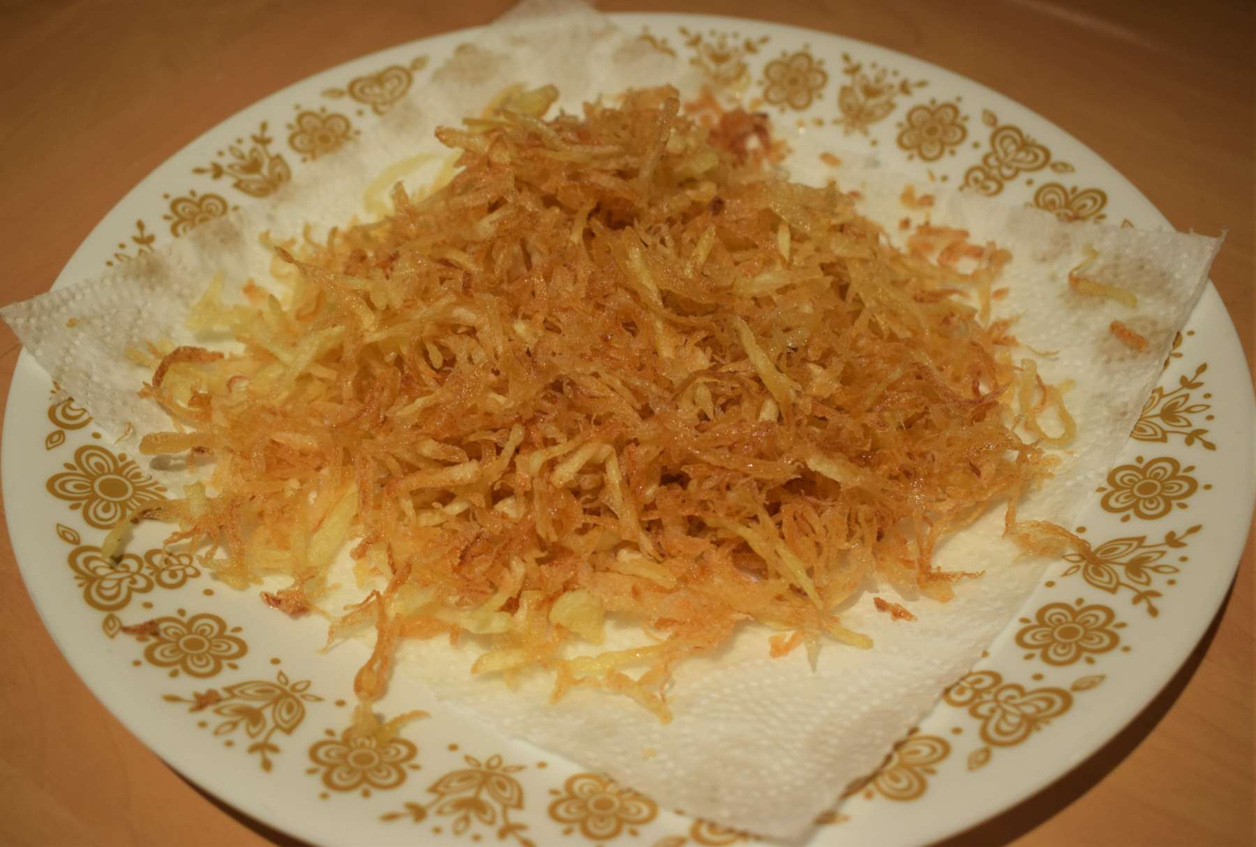 - Take a kitchen tissue lined plate and transfer the jhuri aloo bhaja on it. The kitchen tissue will absorb the excess oil.