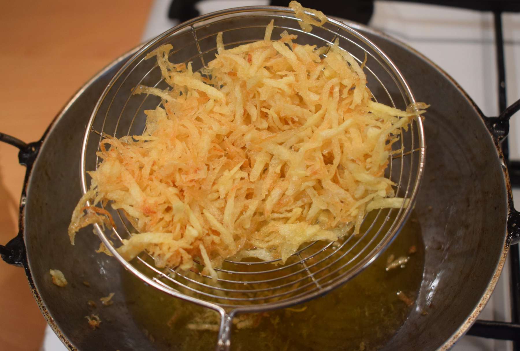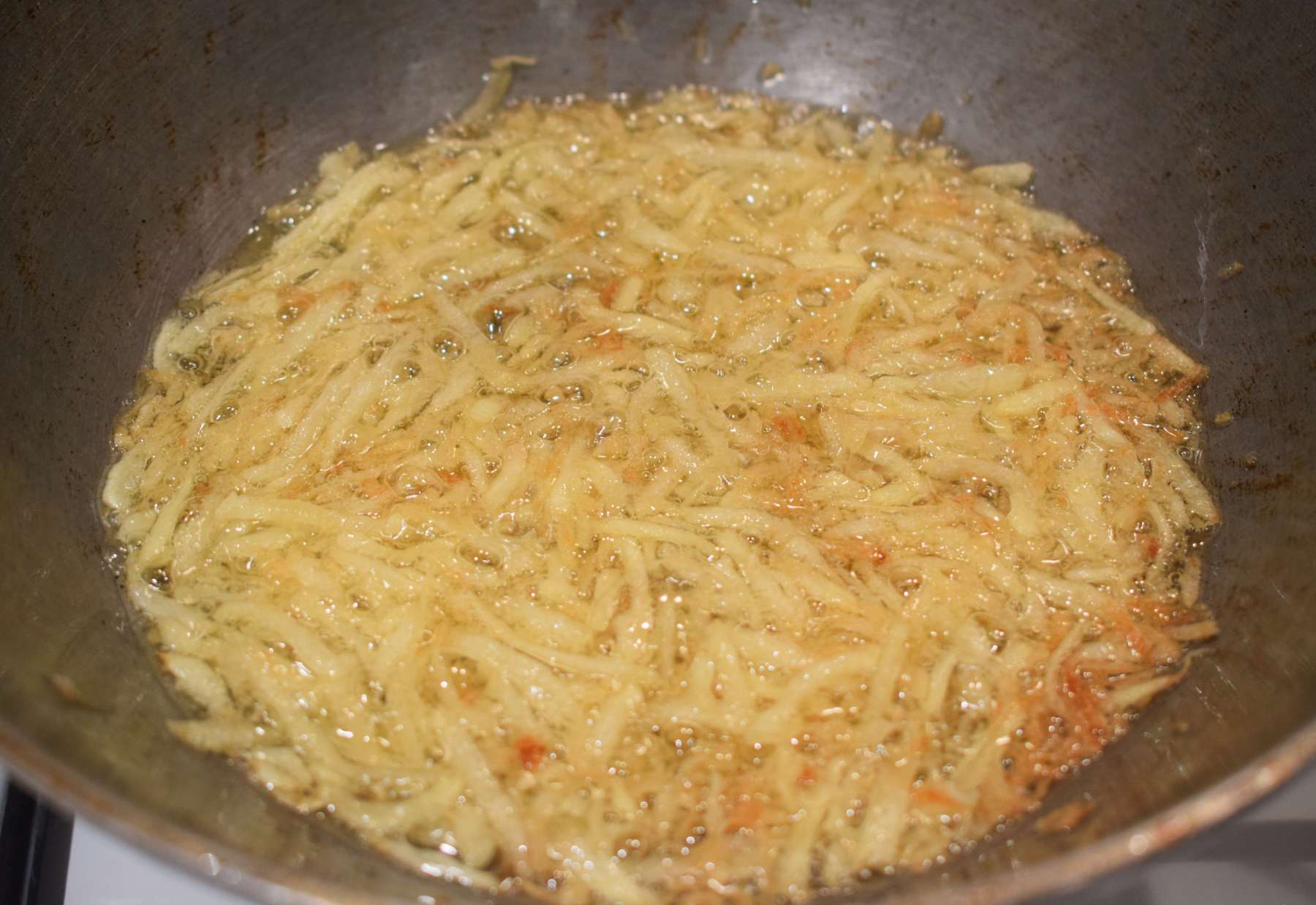 - Take a pan and add enough oil to deep fry the grated potatoes.