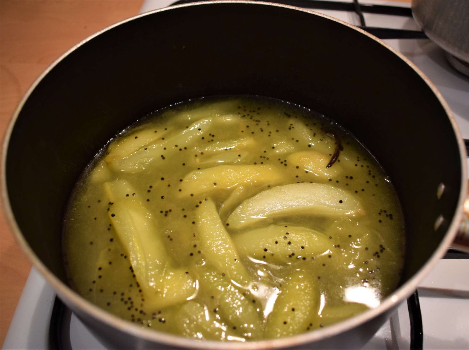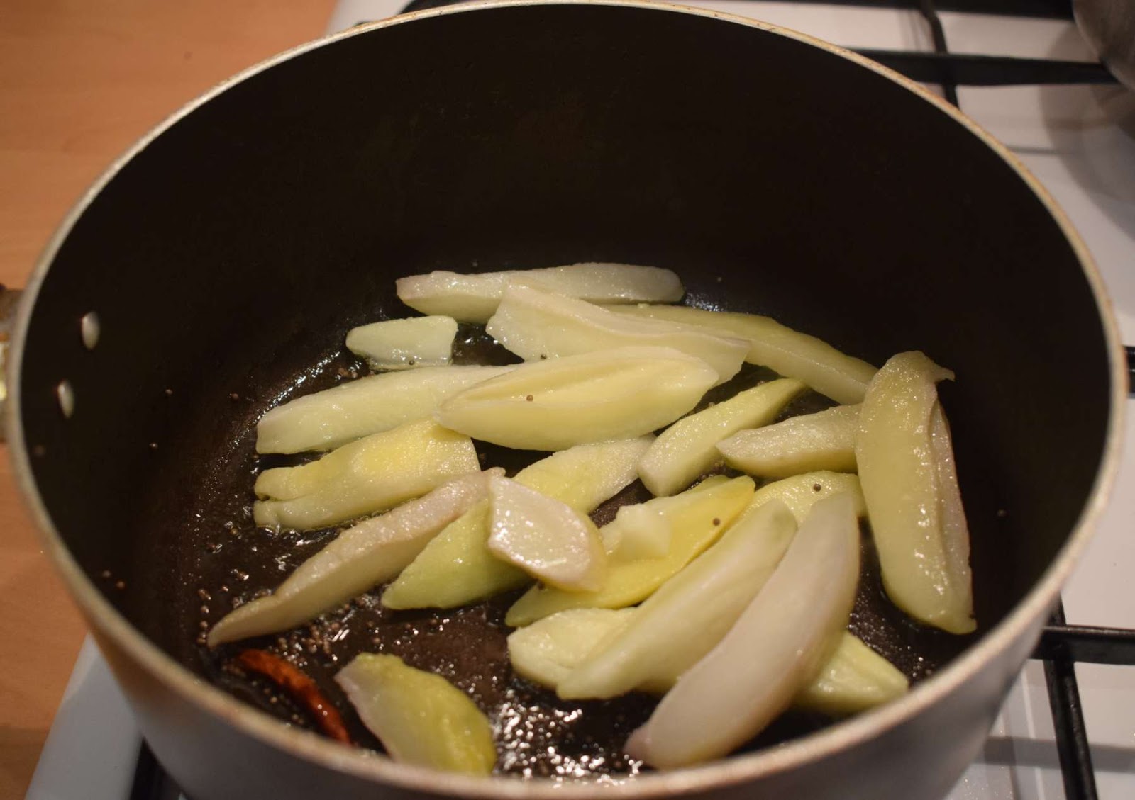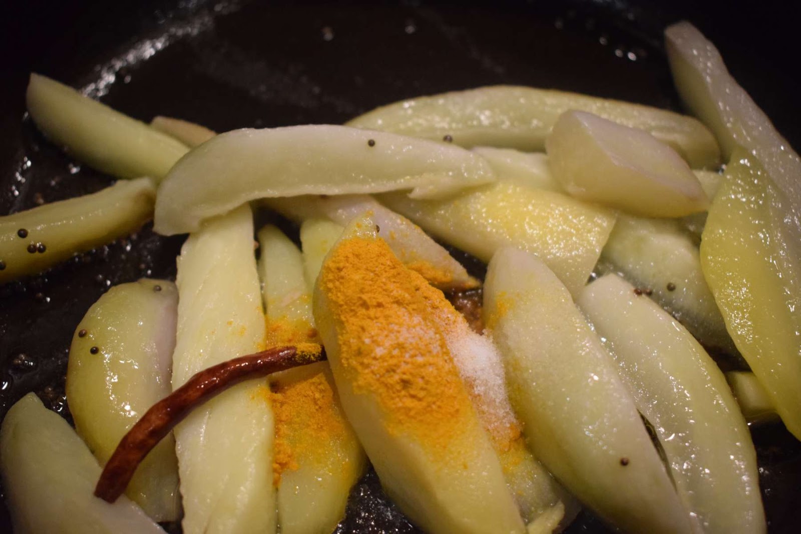 In this preparation, first I have peeled and cut the raw Mangoes in thick slices. Kairi ki Chutney can be prepared in many ways in Indian cuisine. For Chutney preparations, Bengalis would prefer to use Panch Phoran, which is a mixture of five whole spices which constitutes of equal proportions of Fenugreek seeds (Methi), Cumin seeds (Jeera), Nigella seeds (Kalonji), Fennel seeds (Saunf) and Radhuni (Trachyspermum Roxburghianum). Normally, in regions outside of West Bengal, Radhuni is replaced by Black Mustard seeds (Sorshe).