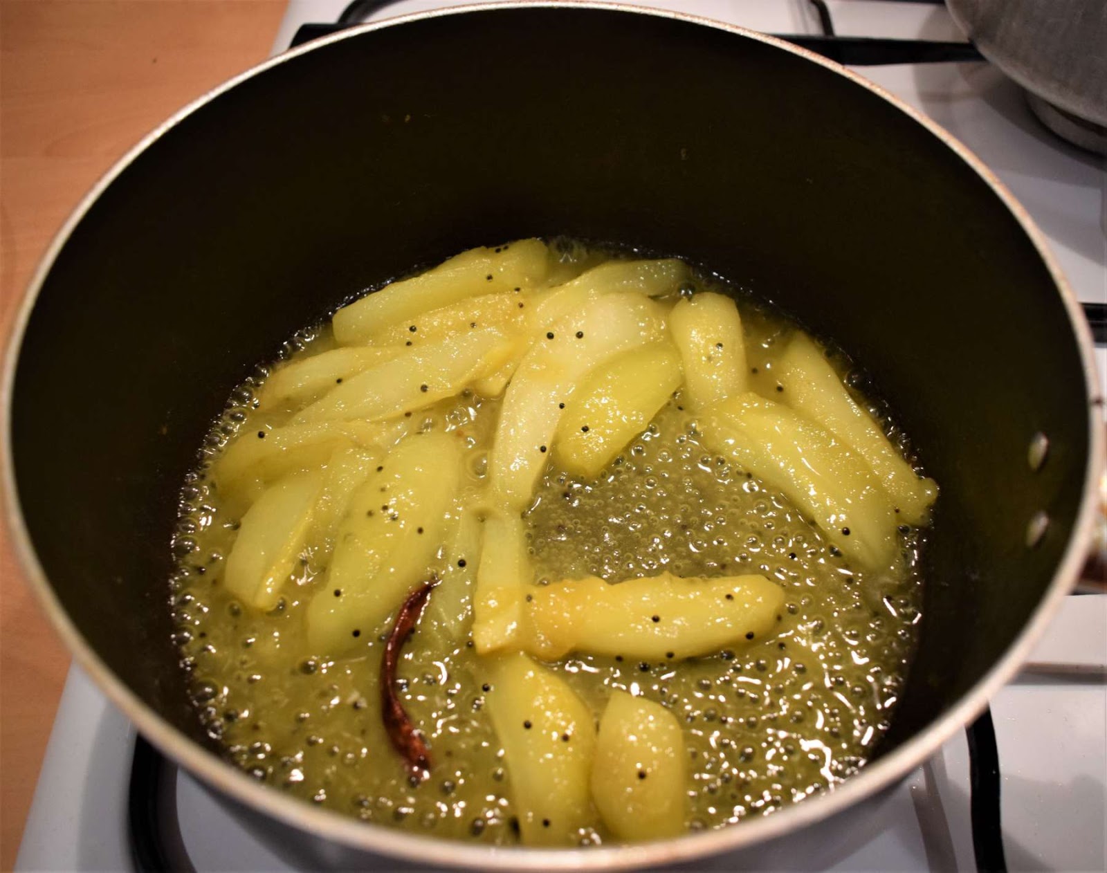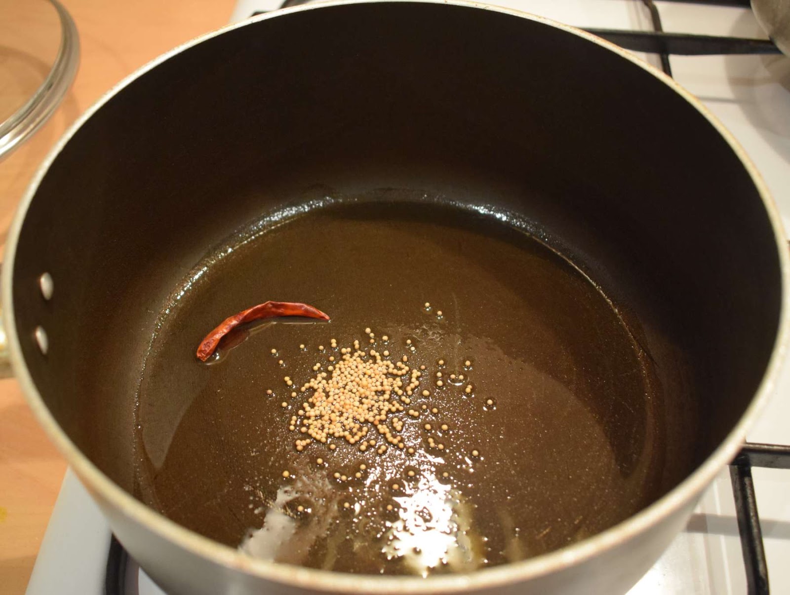 - Add yellow Mustard seeds, whole red dry Chilli and let them crackle.