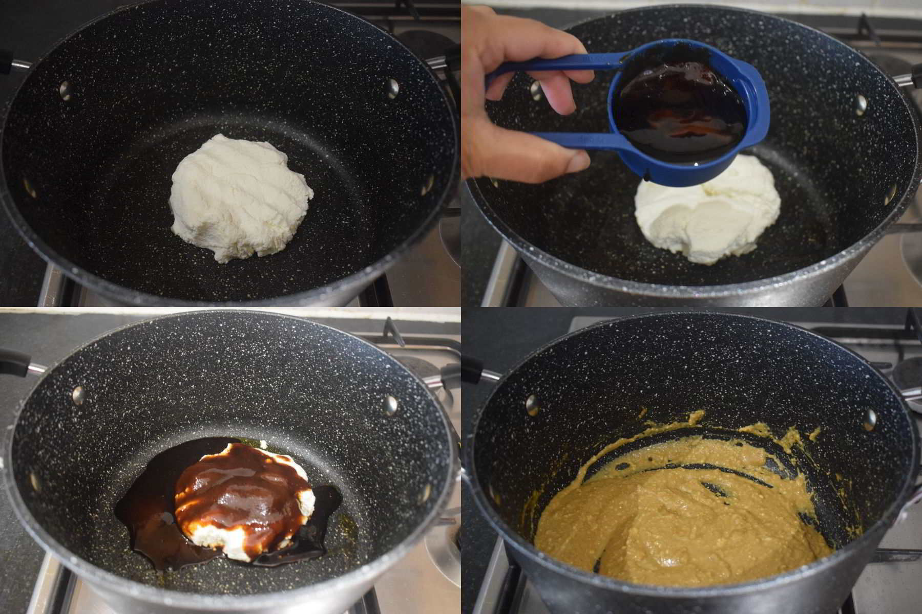 To prepare nolen gurer kachagolla, take a heavy bottom pan and put it on lowest flame. Then add two third of the mashed chenna and nolen gur, one by one into the pan. Mix them thoroughly and cook it on low flame for 5 minutes.