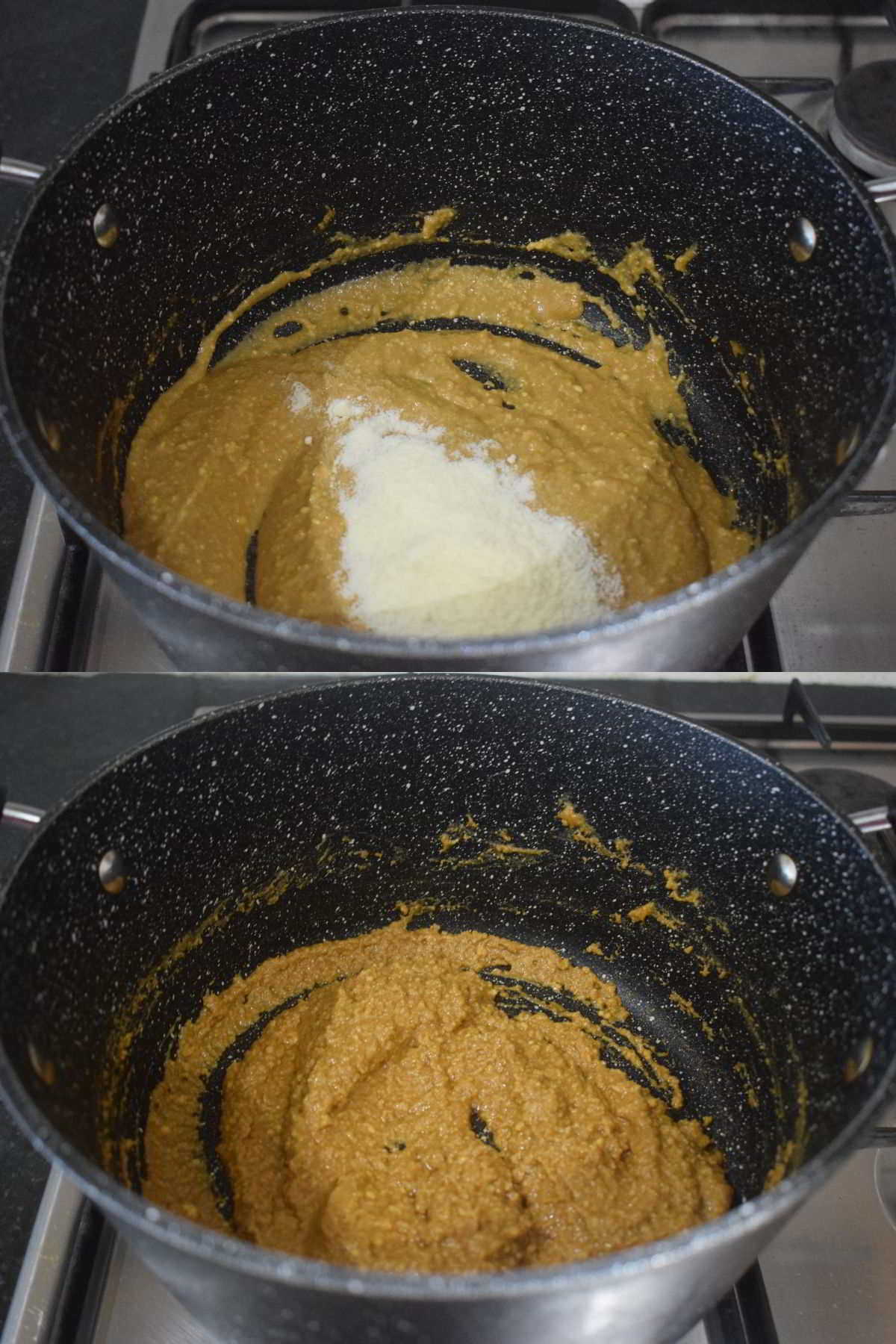 Now, add milk powder into the mixture and mix it evenly. Keep on stirring the mixture with the help of a spatula. Cook it for another 2-3 minutes on low flame until it turns into a mass and the sides get released.