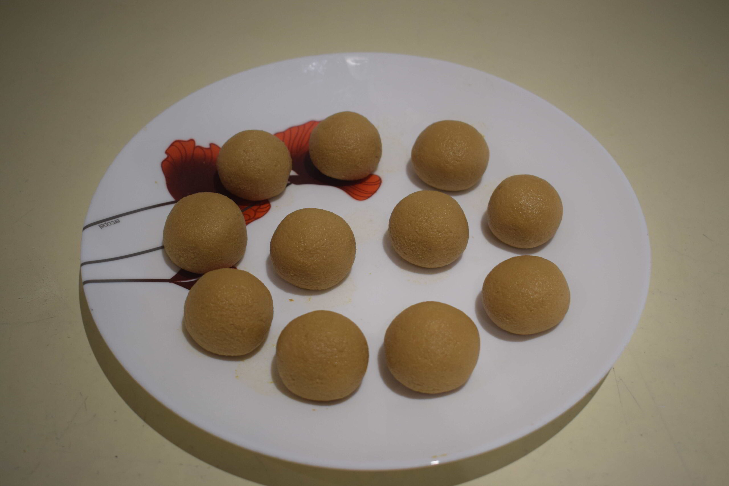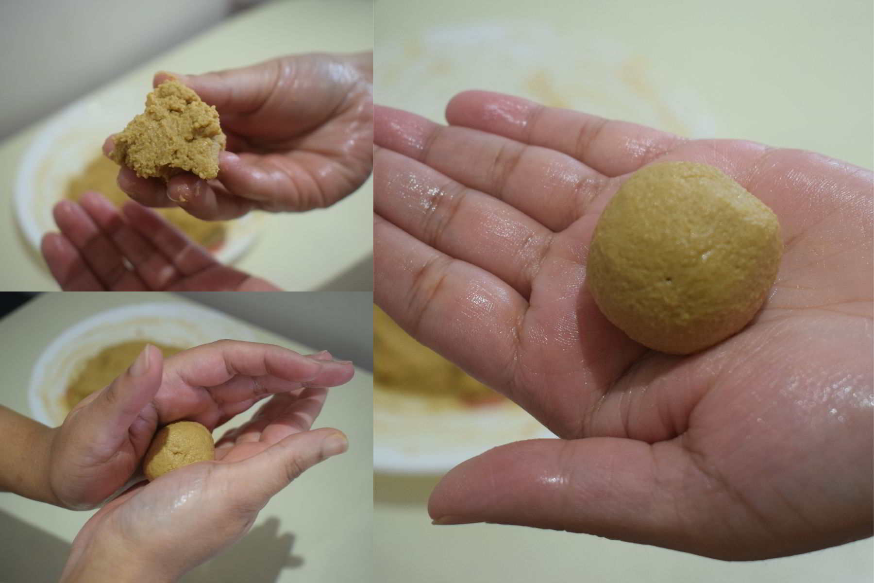- Take a small ping pong ball size portion of mixture in between your palms and shape it into small smooth ball. Repeat the process and shape all the kachagollas.