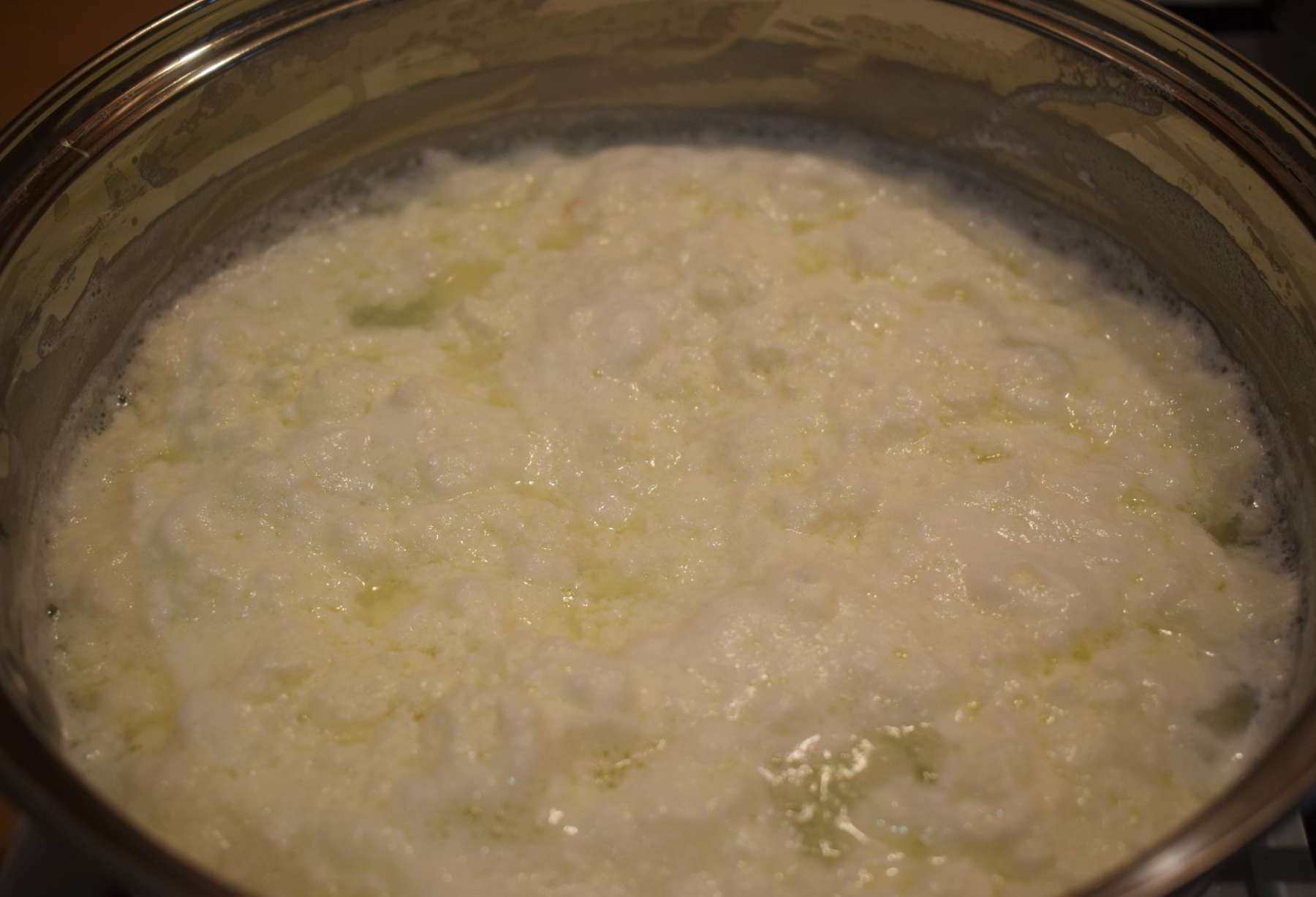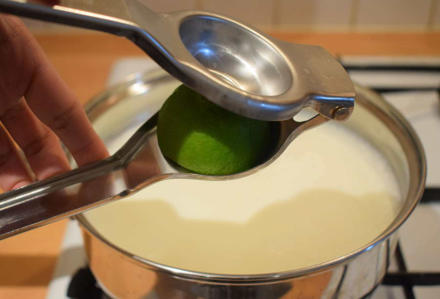 - Once the milk starts boiling, turn the flame to low. Squeeze out the lemon juice into the milk with the help of a lemon squeezer.