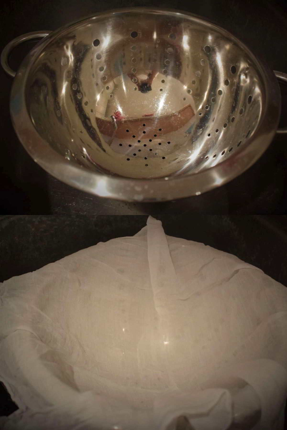 - Place a colander in the sink of kitchen and put a Muslin cloth on the colander.