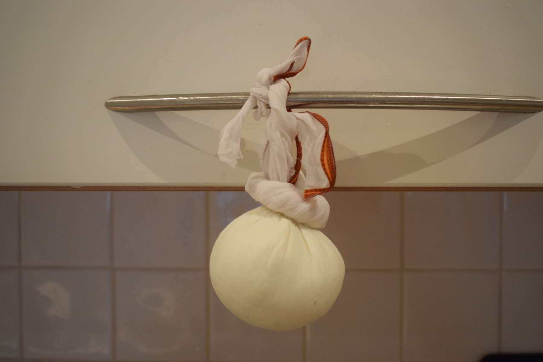 - Squeeze the excess water and then tie a tight knot of the cloth. Hang the Chenna for 30 minutes.