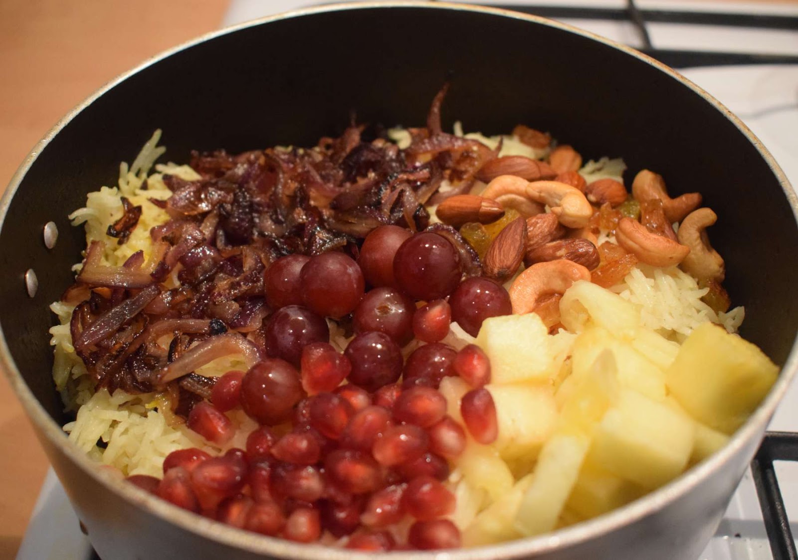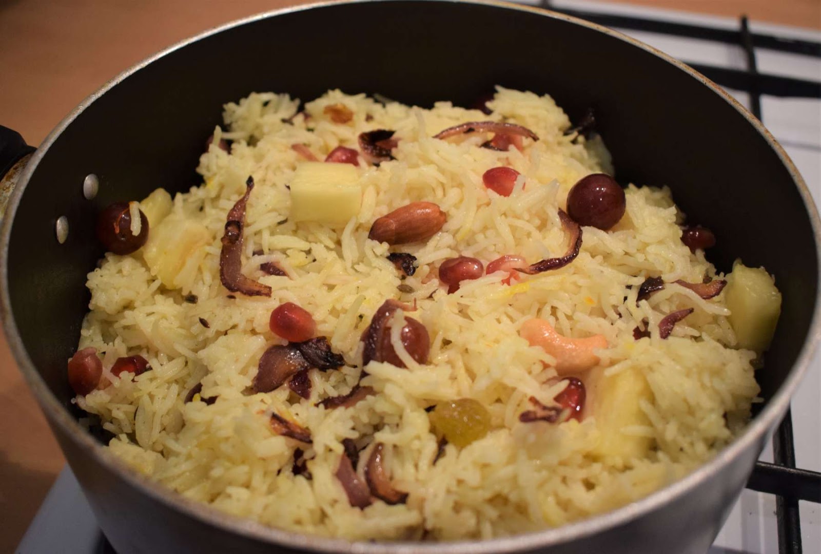 When the rice is done, don’t add the fresh fruits, dry fruits and fried onions into it immediately. At this point of time, the rice is too soft, and it may break. It is always better to add them after 15-20 minutes and mix it very delicately.