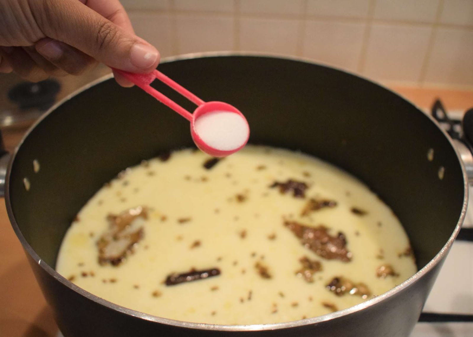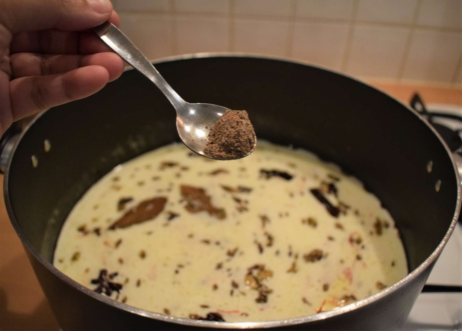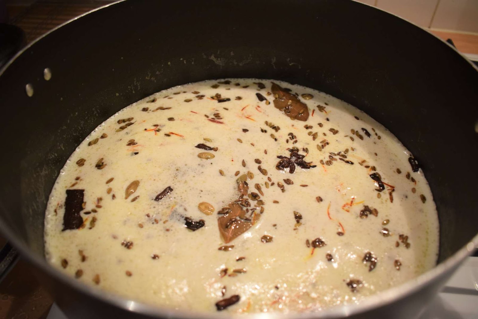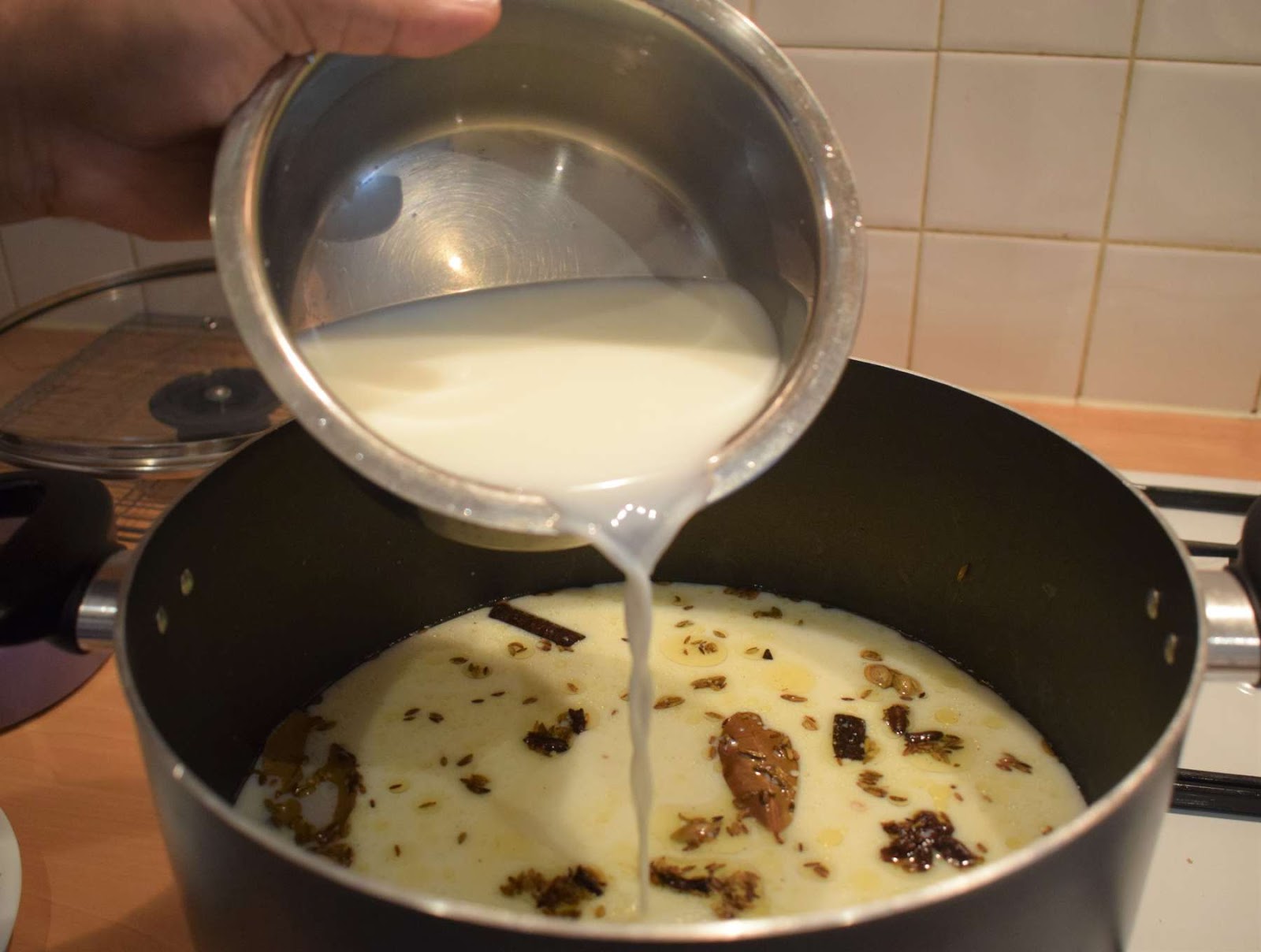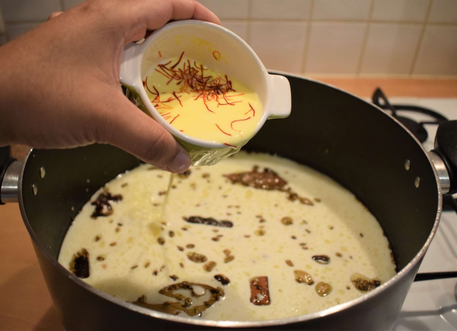 I have tempered the whole spices in clarified Butter (Ghee) and then added water-milk mixture into it. After this, I have added the Saffron milk and Cardamom powder into it to flavour up.