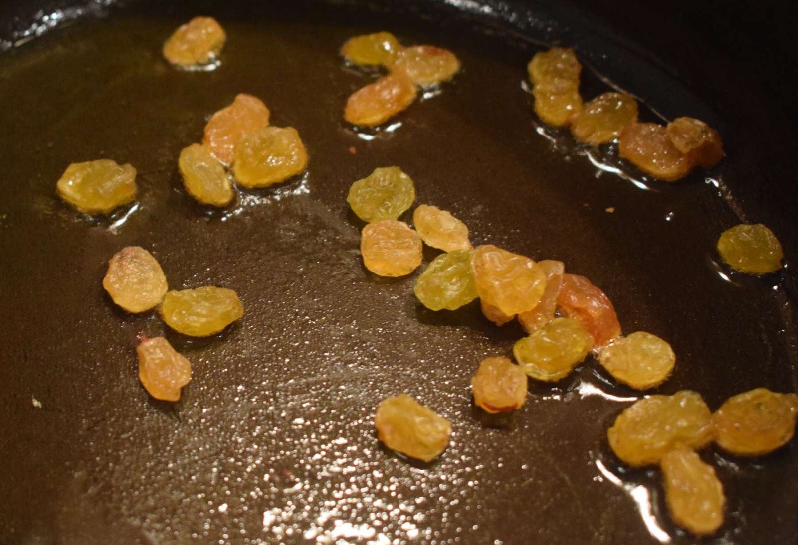 - Add Raisins and fry them for few seconds. Keep them aside on a plate.