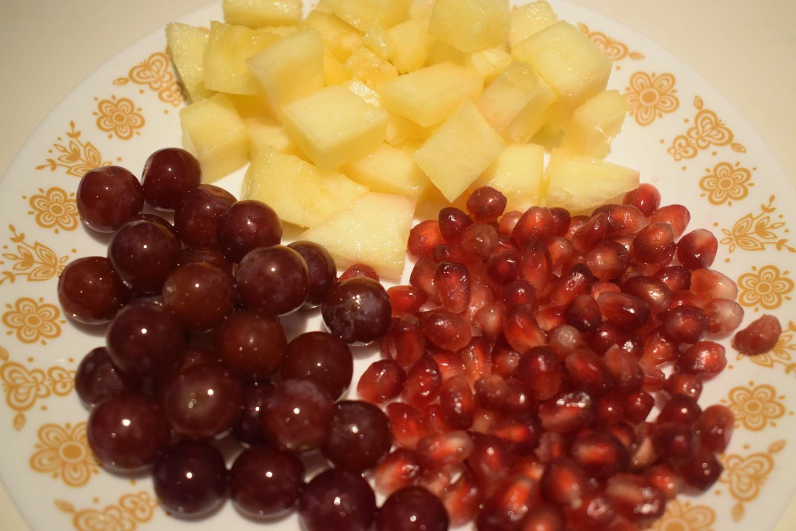 - Add the Pineapple, Pomegranate, red Grapes, fried dry fruits, fried Onions (Step 14) into it and mix it well.