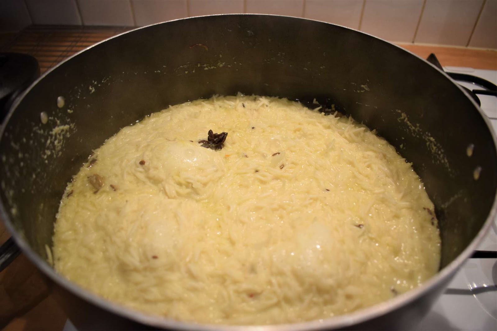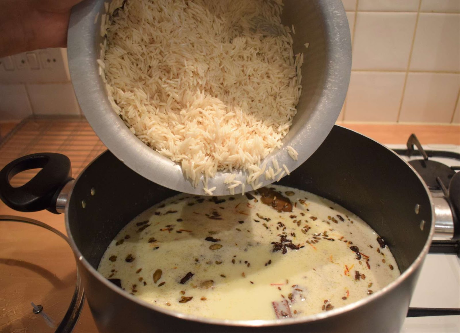I have added the soaked rice when the milk and water mixture started simmering. It is always better to add the rice at this point of time. Then cover the pan and cook it in medium flame initially and not in high unlike other pulao recipes because the water mixture contains milk and milk has the tendency to flow out during the time of boiling. Then put the flame in lowest and cook the final stage of the dish with cover.