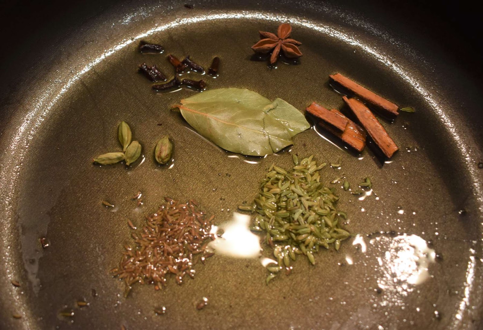 - Add Cumin seeds, Fennel seeds, Cloves, Cardamoms, Cinnamon sticks, Bay leaf, Star Anise and let them crackle.