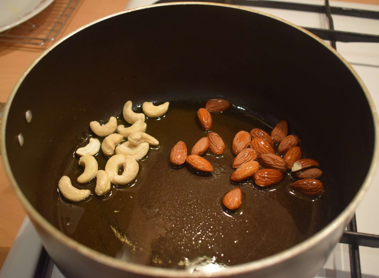 - Add Cashew nuts, Almonds into the pan and fry them in medium flame for a minute until the nutty smell comes out. Keep them aside on a plate.