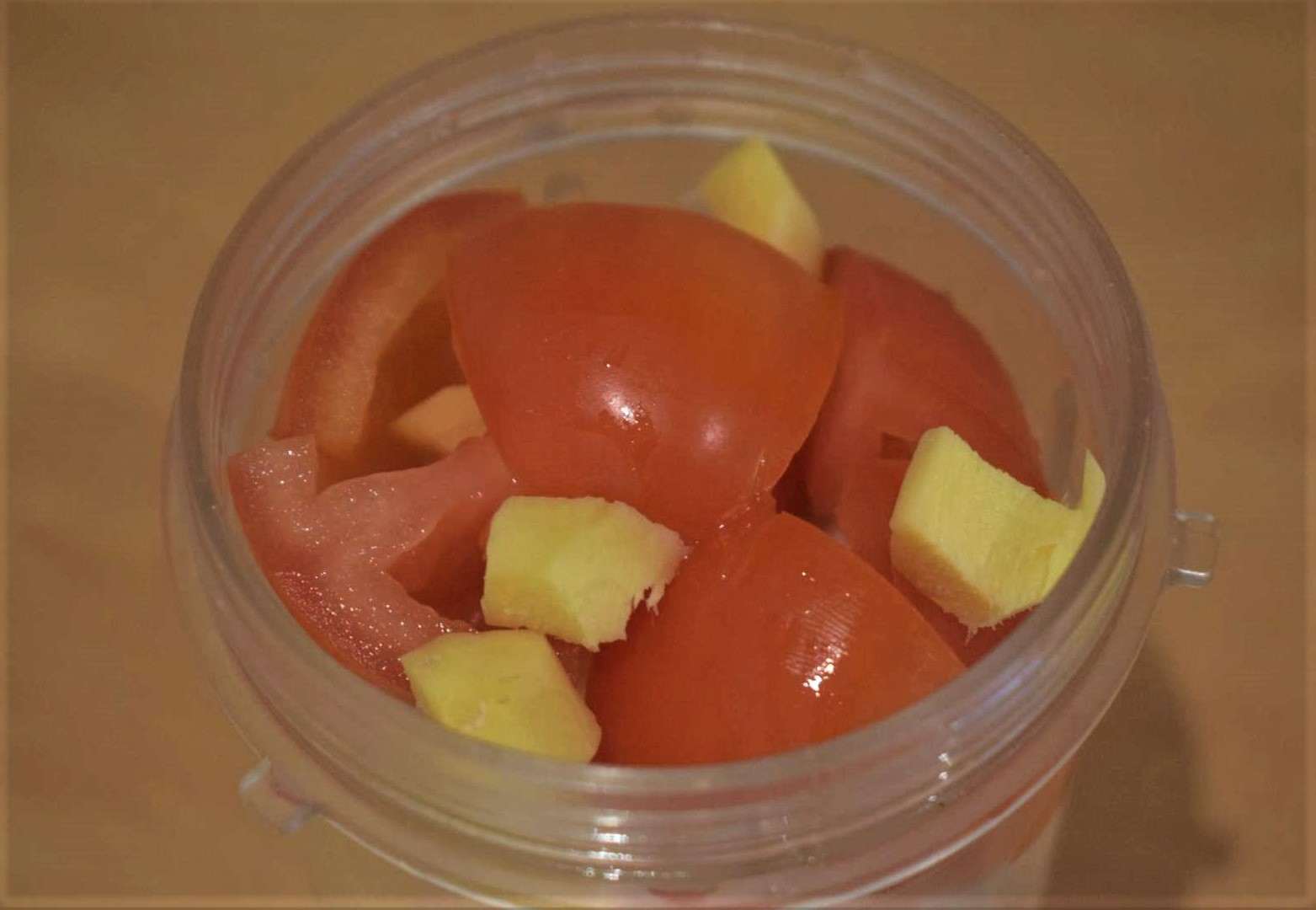- Take the small jar of the mixer grinder and add diced onions, tomatoes, ginger and garlic into it.