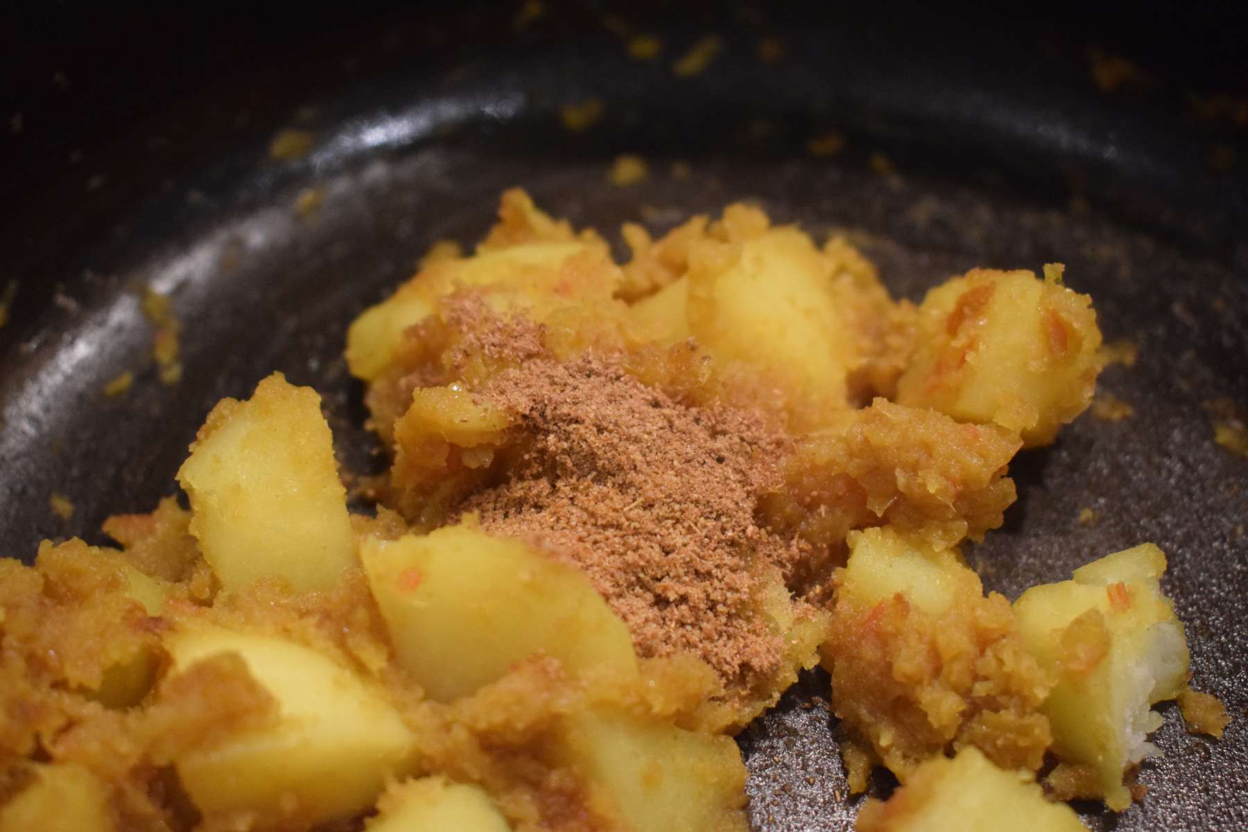 - Once the potatoes are done, add cumin powder, coriander powder and give a nice mix.