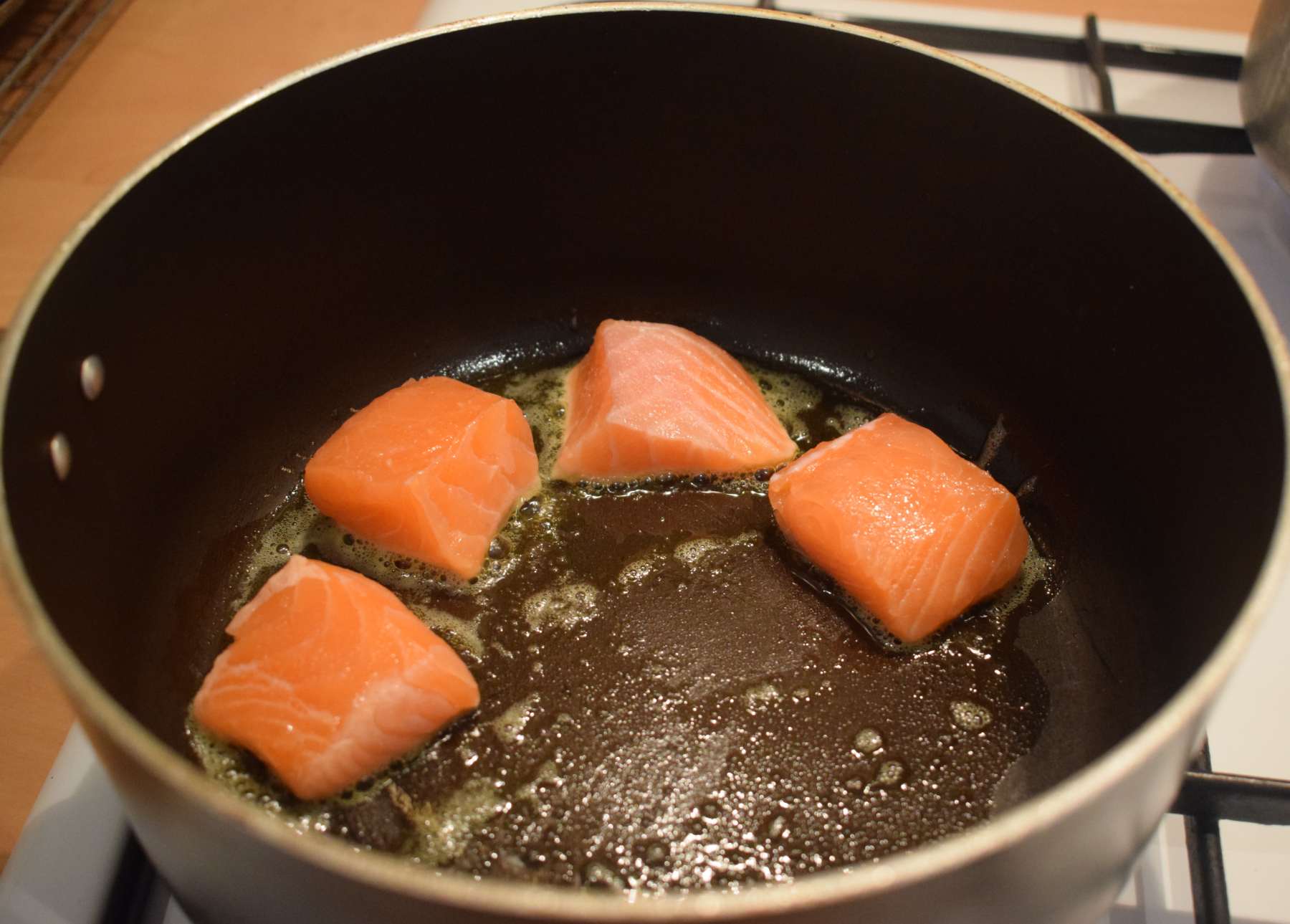 - When the Butter starts bubbling add the Salmon pieces into the pan.