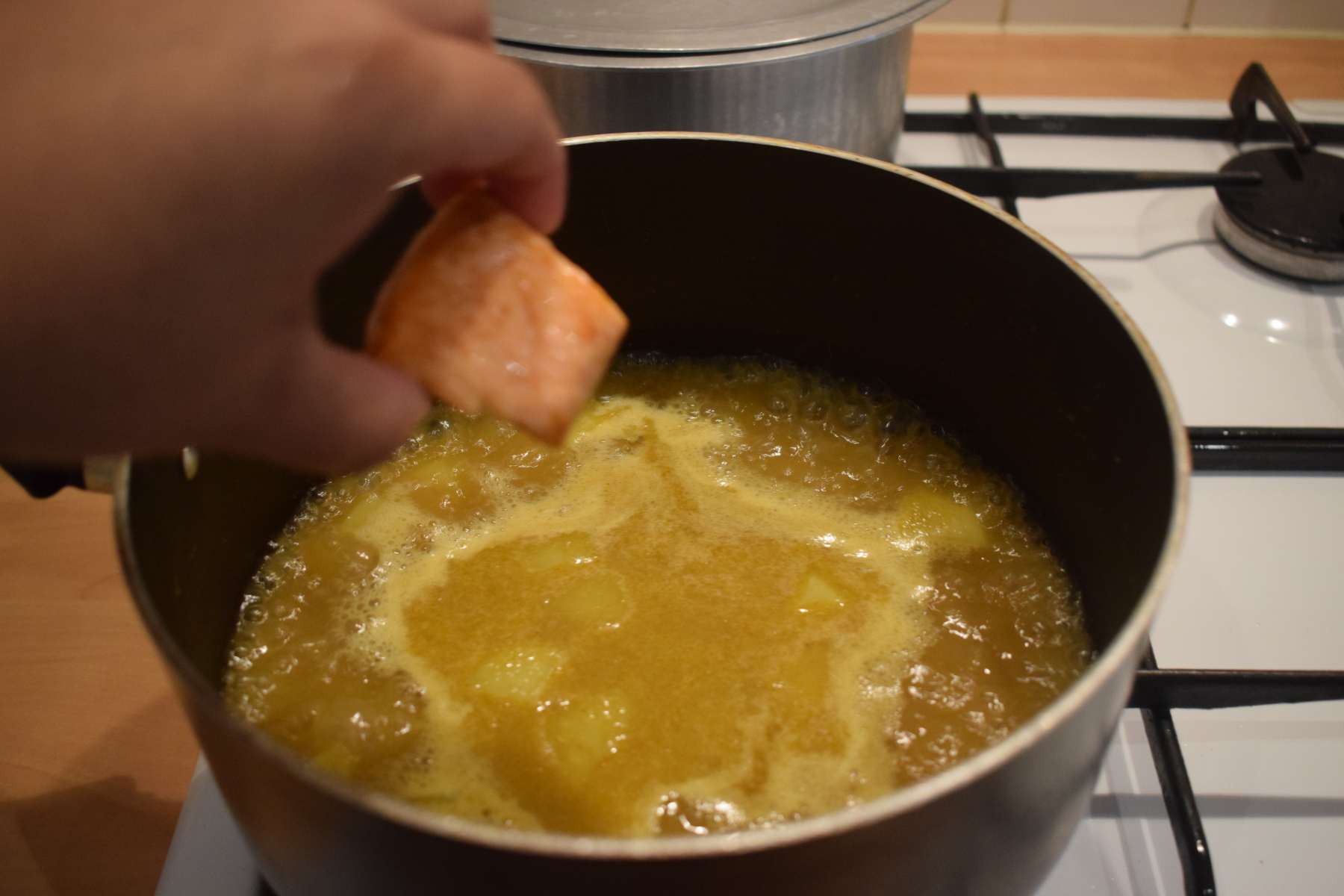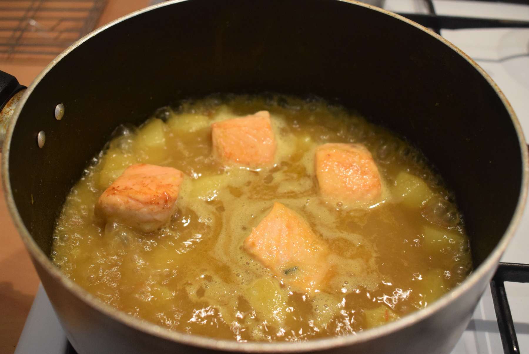 - Put the flame in low and add the fried salmon pieces (Step 8) into the pan.