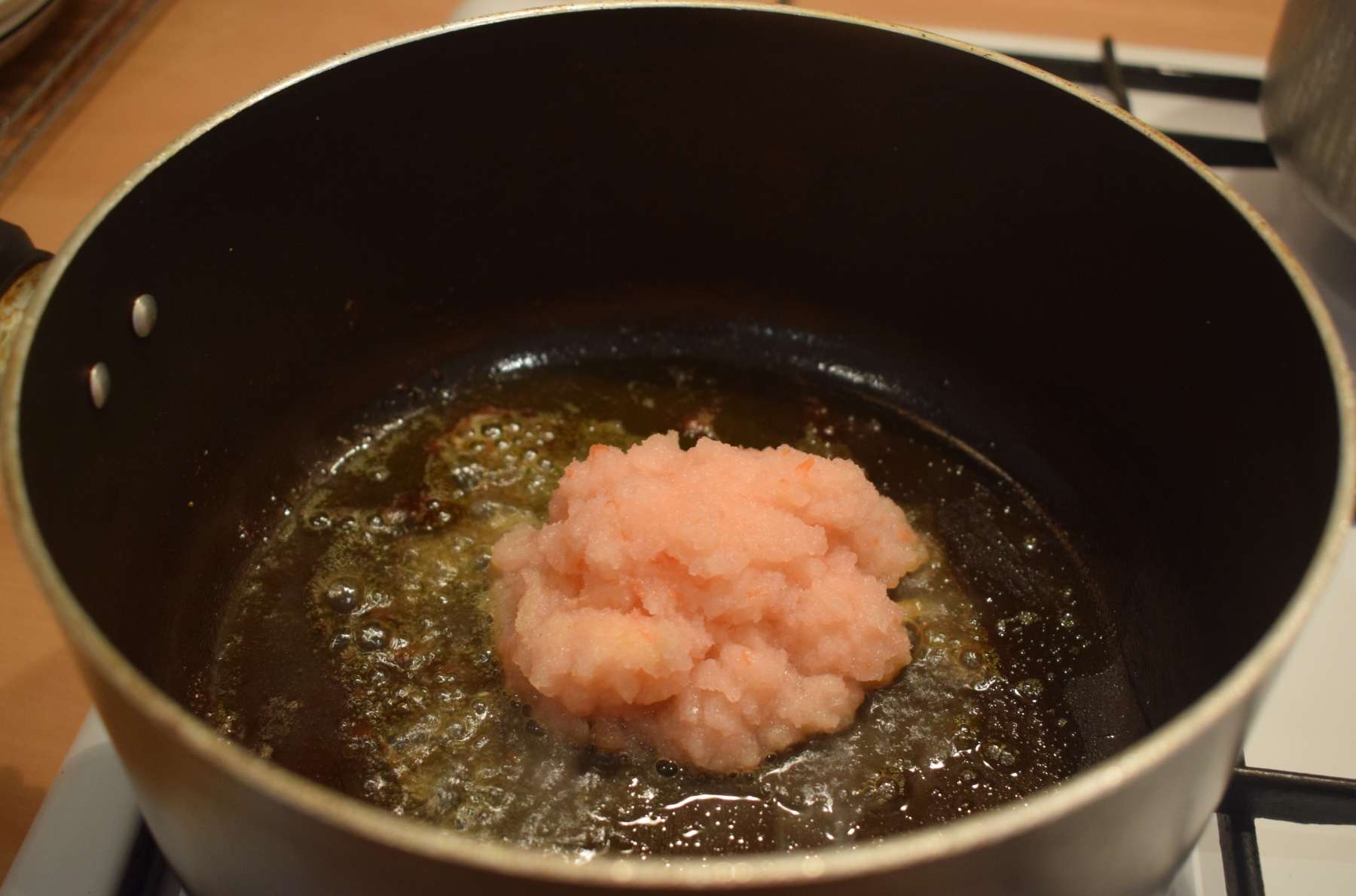 - Put the flame in low and add the onion masala paste into the pan (Step 2). Mix the masala quickly.