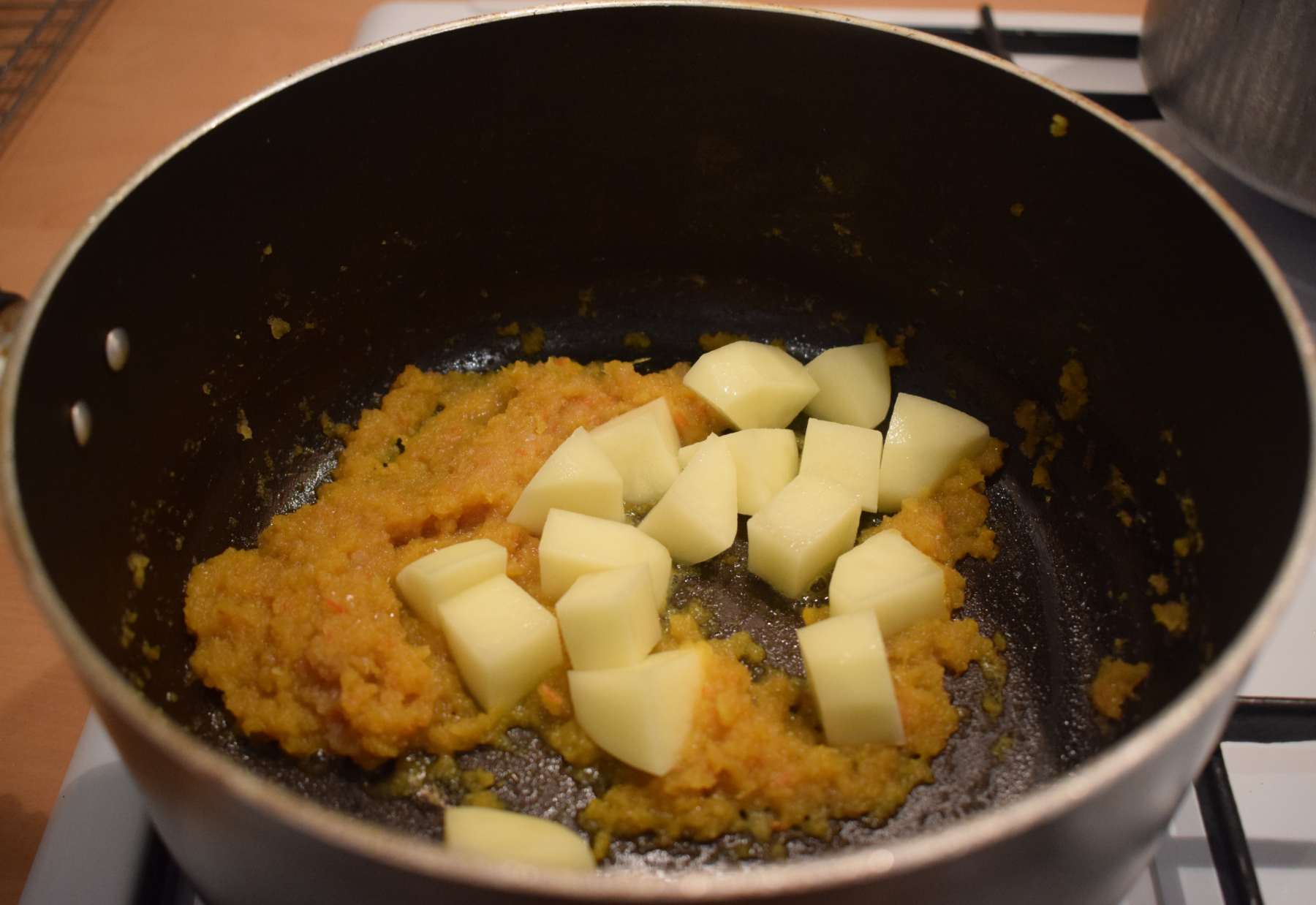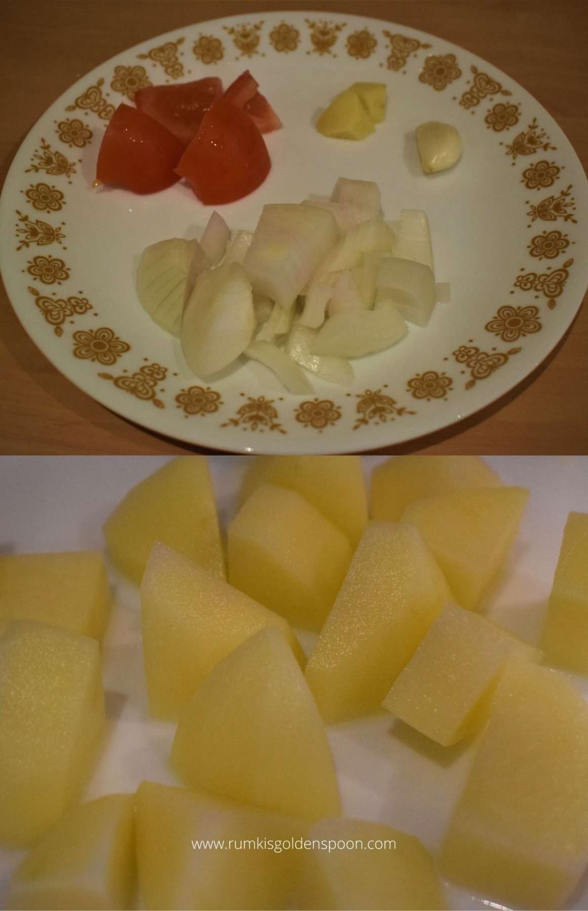 I have added some more butter into the pan and added the onion tomato paste into it. I have cooked it until it releases oil and then added the potato chunks into it. Put on the lid of the pan and cook them until potatoes are done.