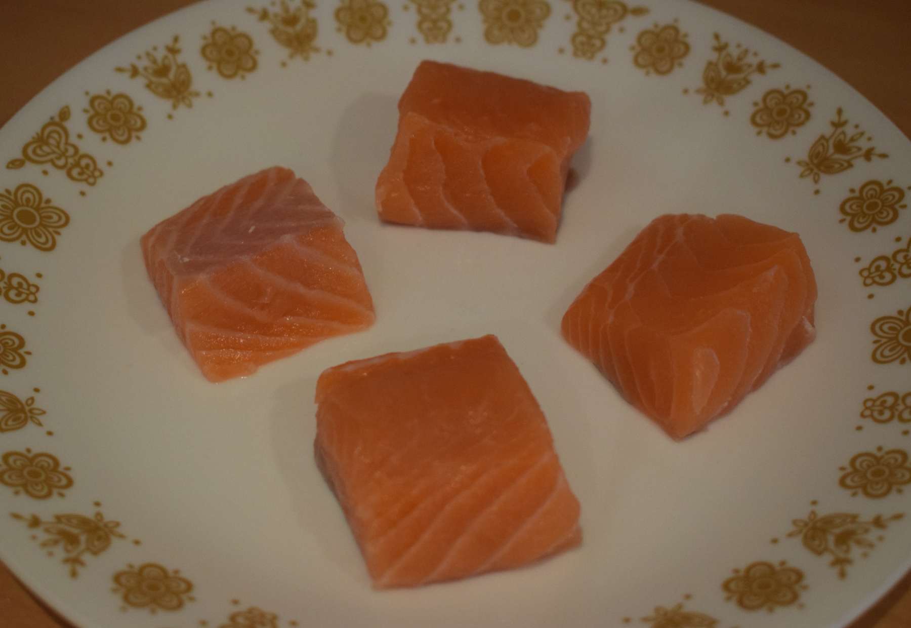 - Pat the Salmon fillets with kitchen tissue to remove the excess moisture and cut into four small pieces.