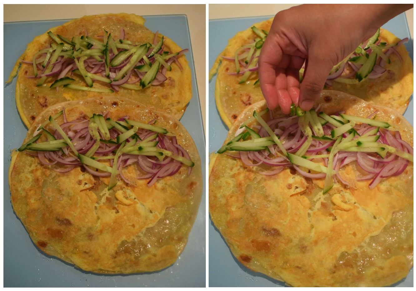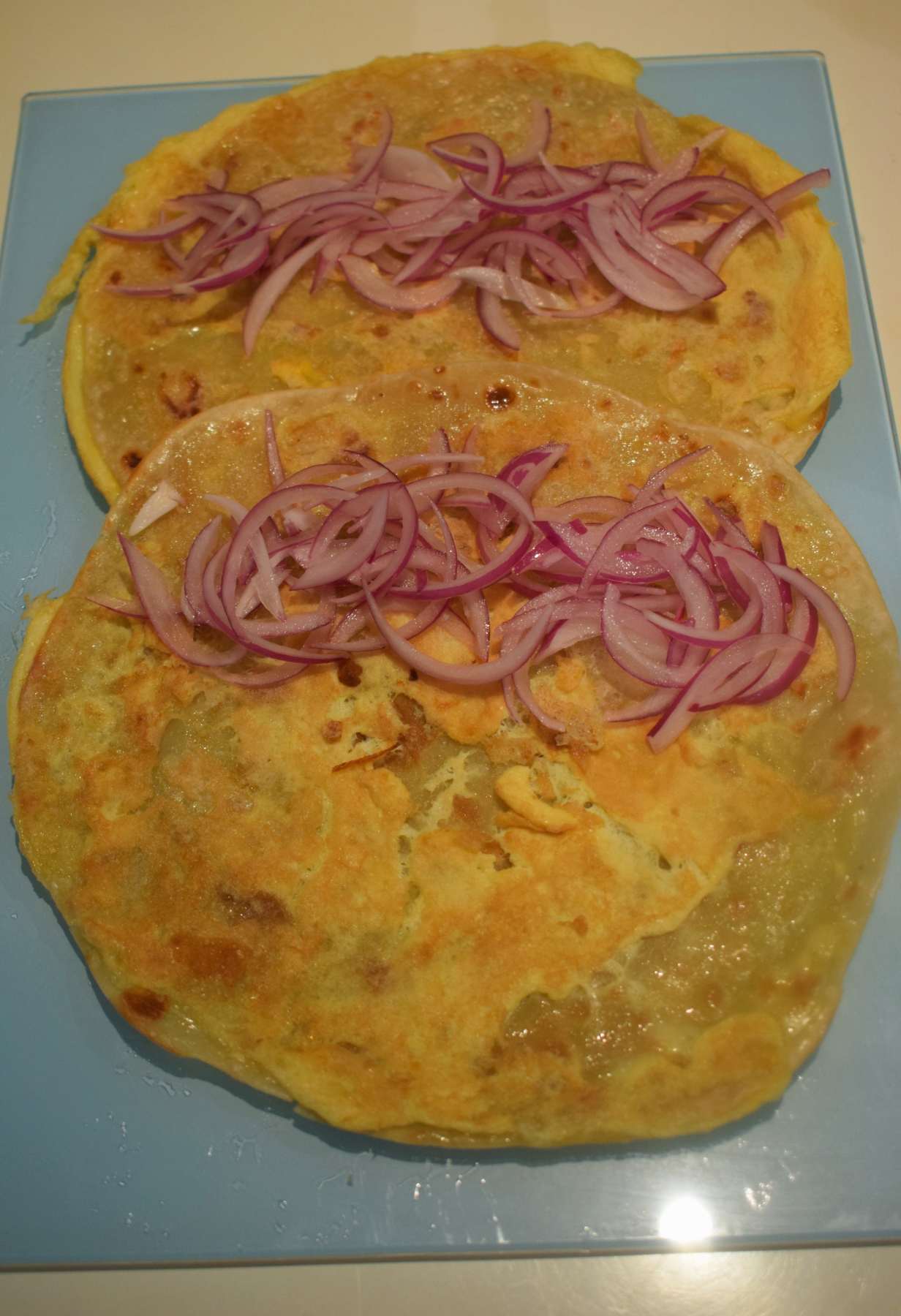 - Add sliced onion (Step 7) on one side of the paratha but leave a gap for wrapping the paratha.