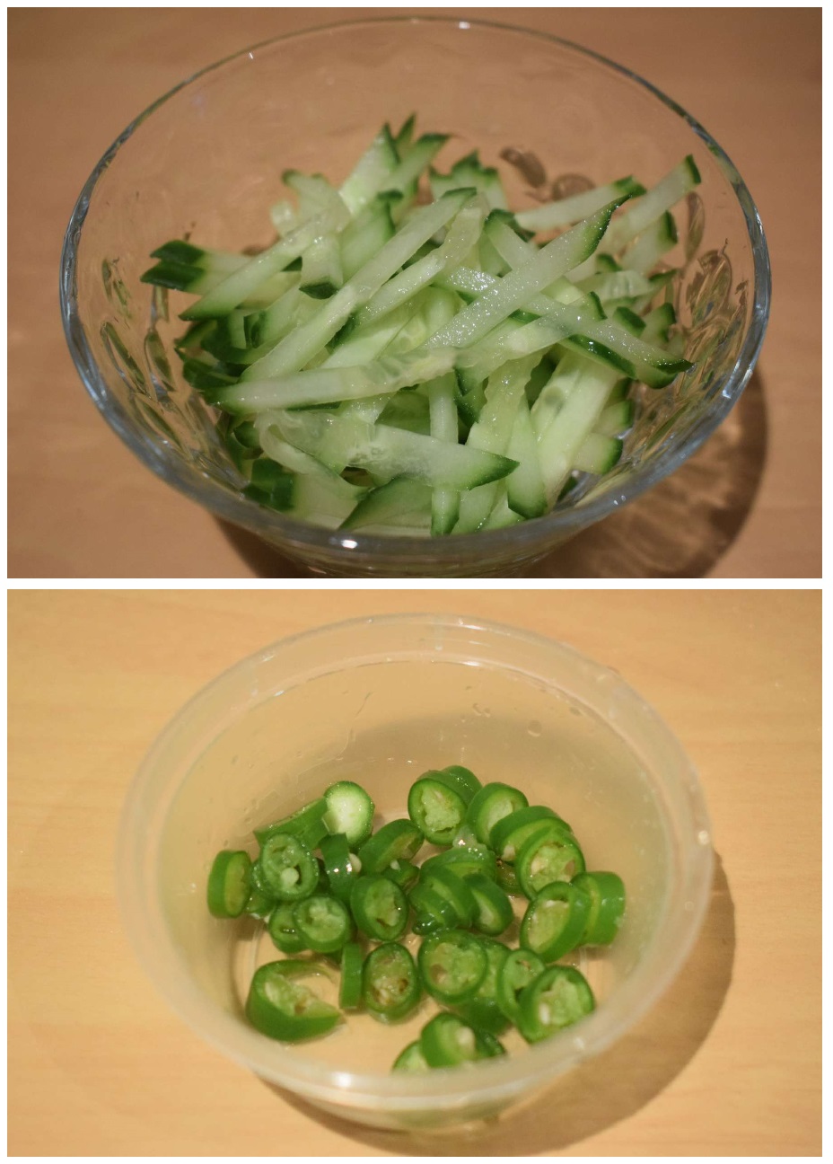 - Cut the cucumbers into julienne and slice the green chillies and keep them aside.