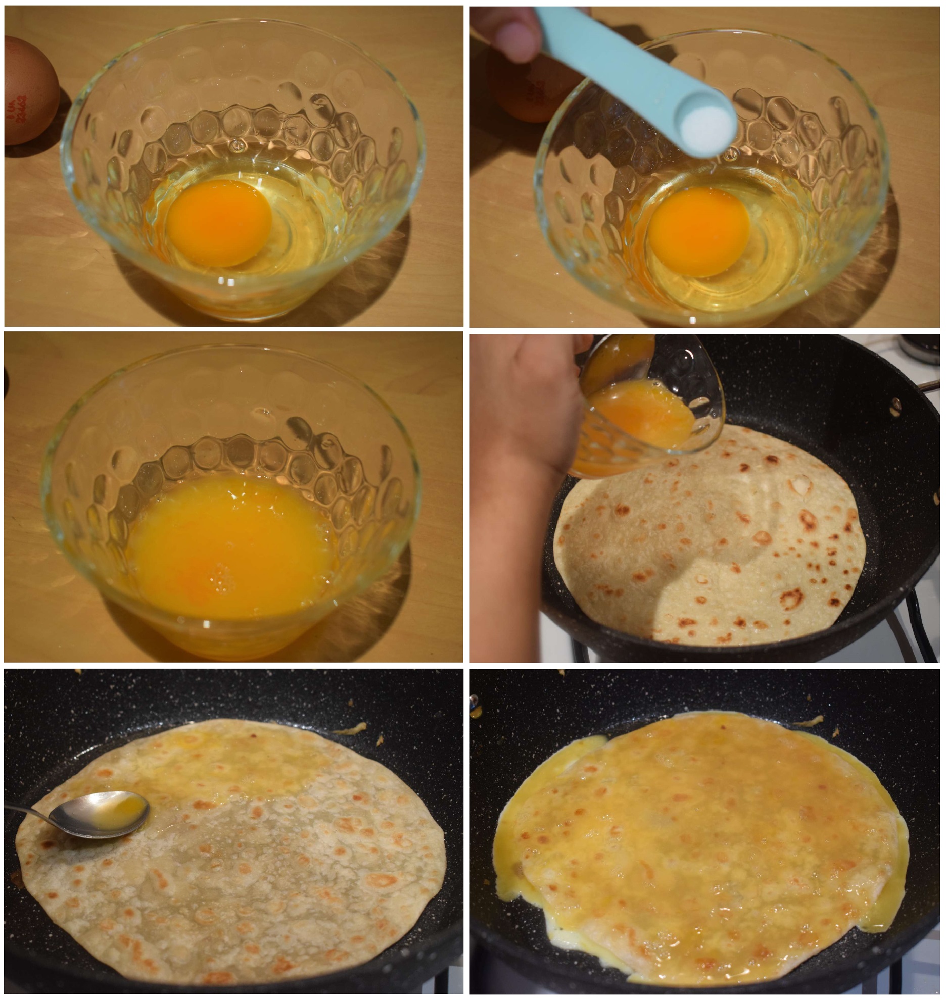 - In a bowl, break an egg and add a pinch of salt into it. Whisk the mixture nicely and pour it over the paratha. Spread the mixture with a spoon.