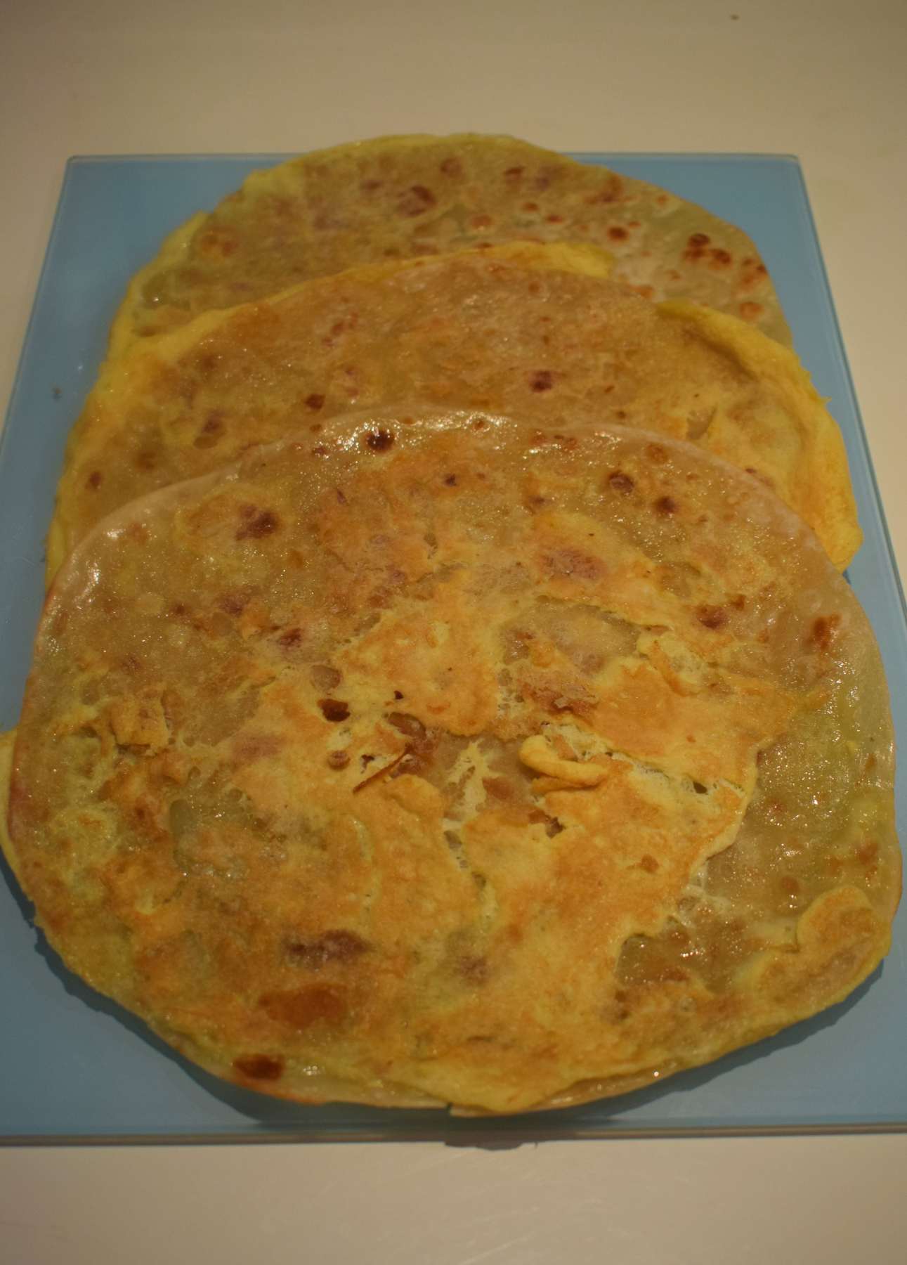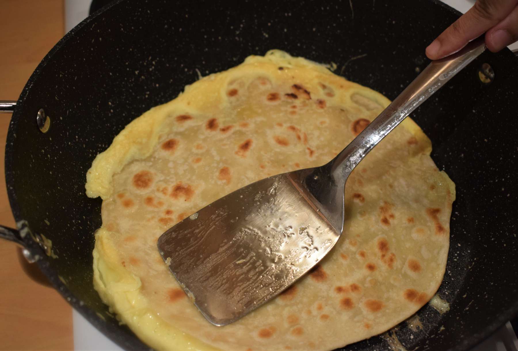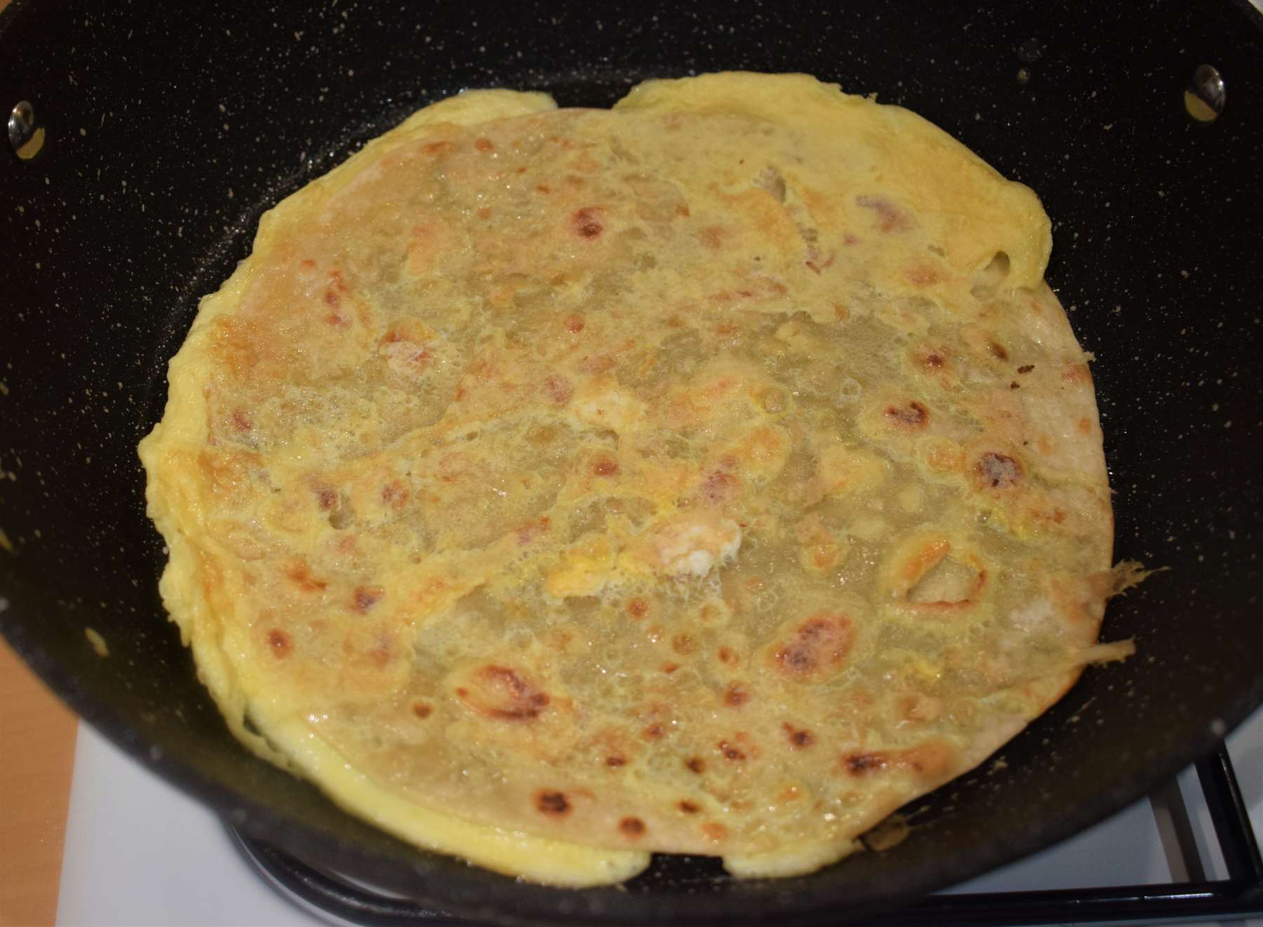 - Transfer the paratha on a flat surface facing the egg side on the top.