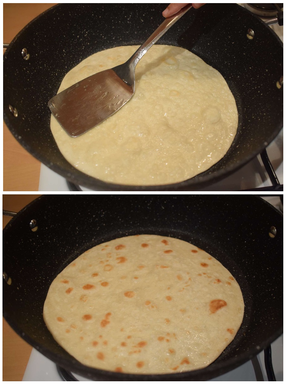 - Put a heavy bottom pan on medium flame and then roll the disk to a thin paratha. No need to apply oil or flour to roll the paratha.