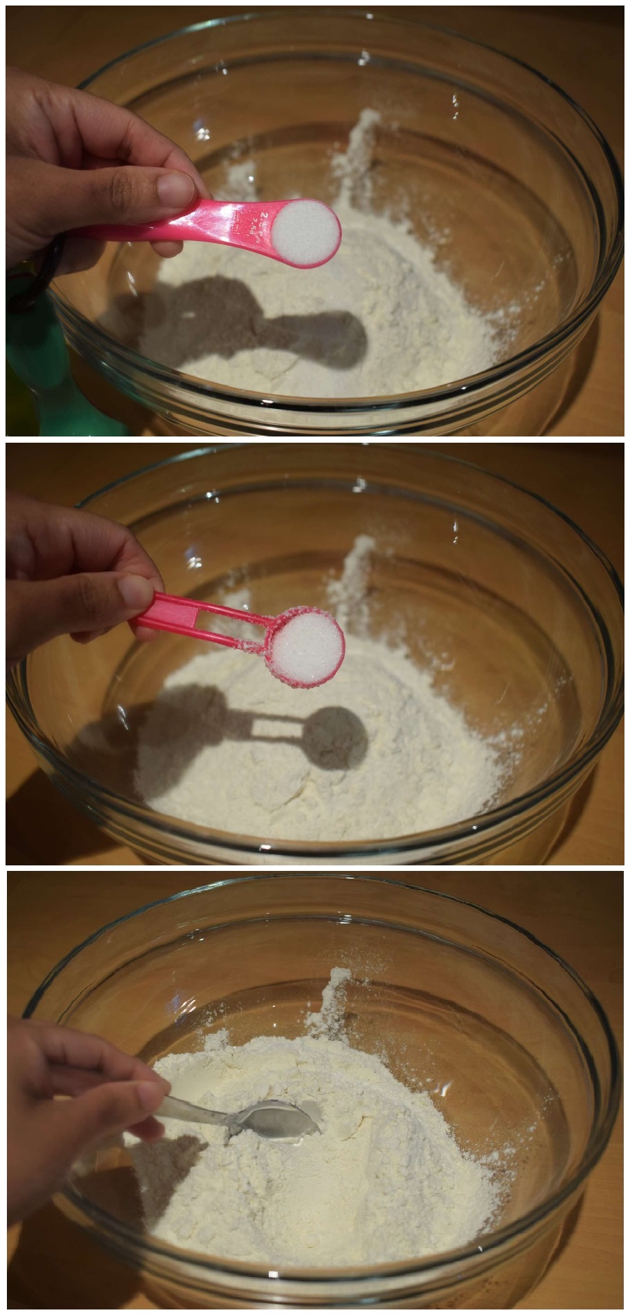 - Add ½ teaspoon salt, 1 teaspoon sugar into the bowl and mix all the dry ingredients nicely with the help of a spoon.