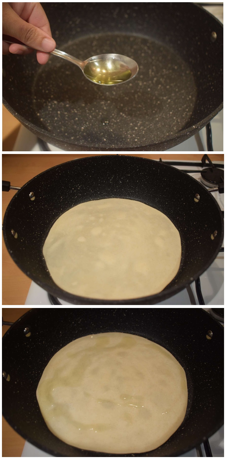 - Drizzle 1 teaspoon of oil into the pan and place the rolled paratha on it. Pour 1 more teaspoon of oil over the paratha and spread it.