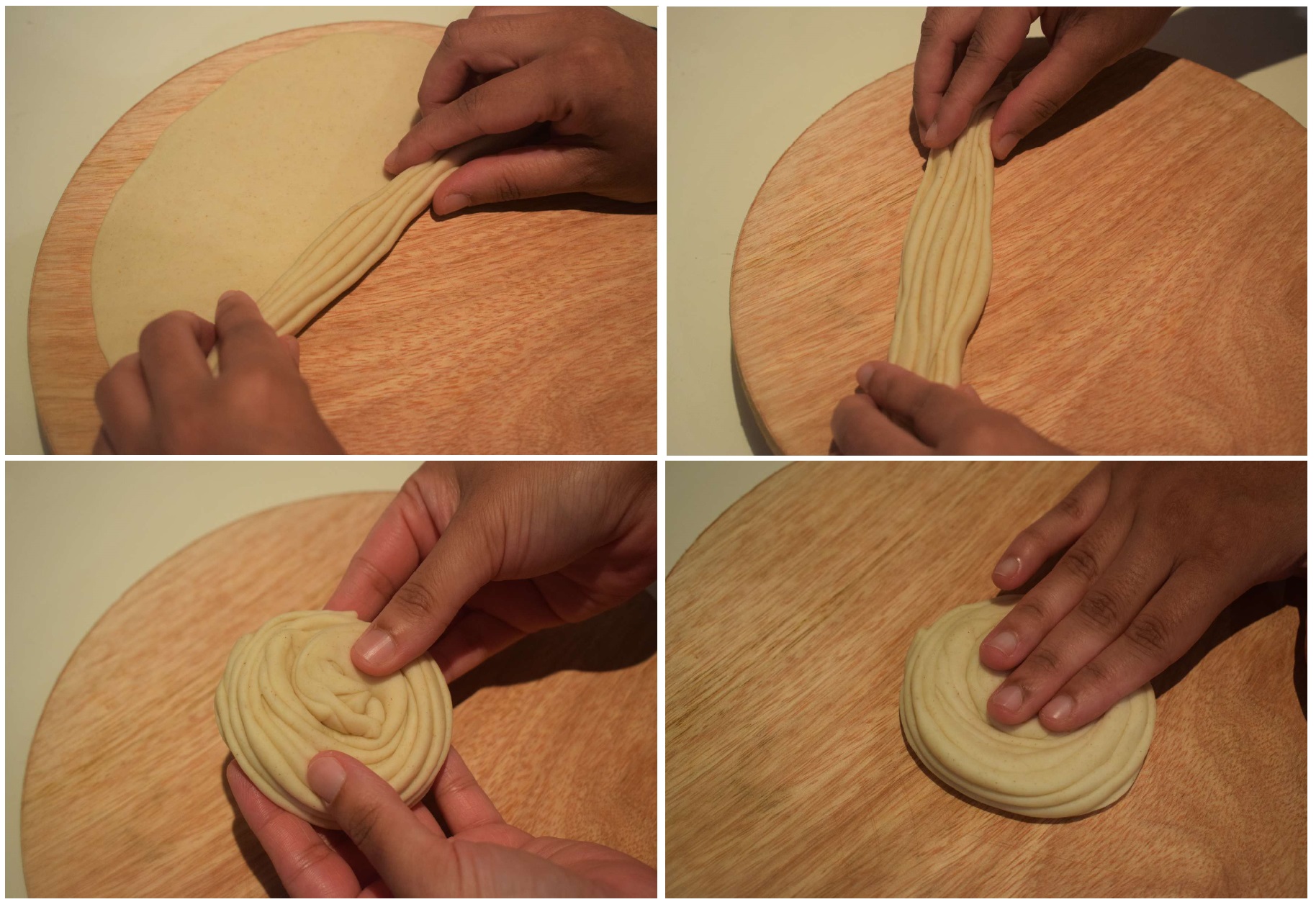 - Start from the edge of the thin paratha to make small pleats by folding repeatedly. Then swirl the long thick folded paratha to a round disk like pinwheel pizza.