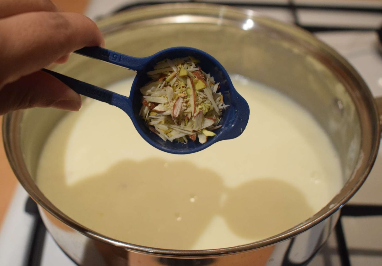 - Add half of the sliced Cashew and pistachio nuts into the pan and give a nice mix. Keep the rest of the dry nuts for garnishing.