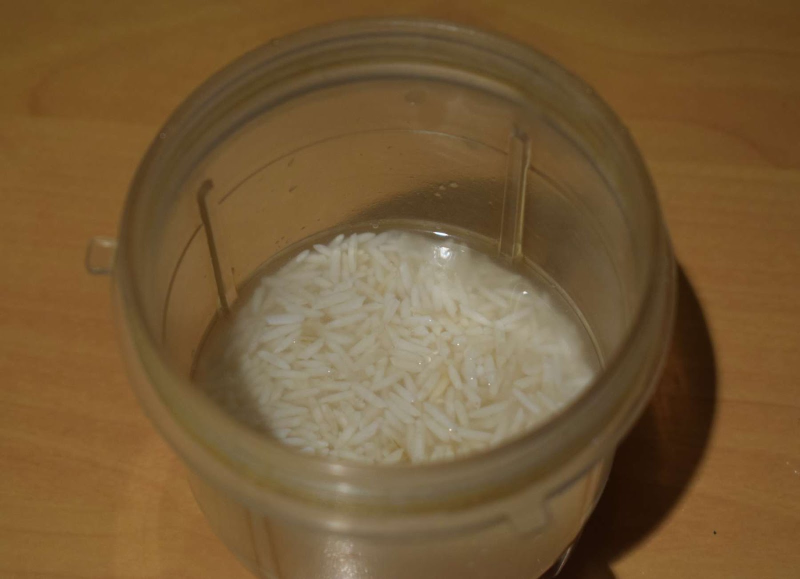 - Drain the excess water and transfer the rice into a jar of grinder. Add 3 tablespoons of fresh water into the jar.