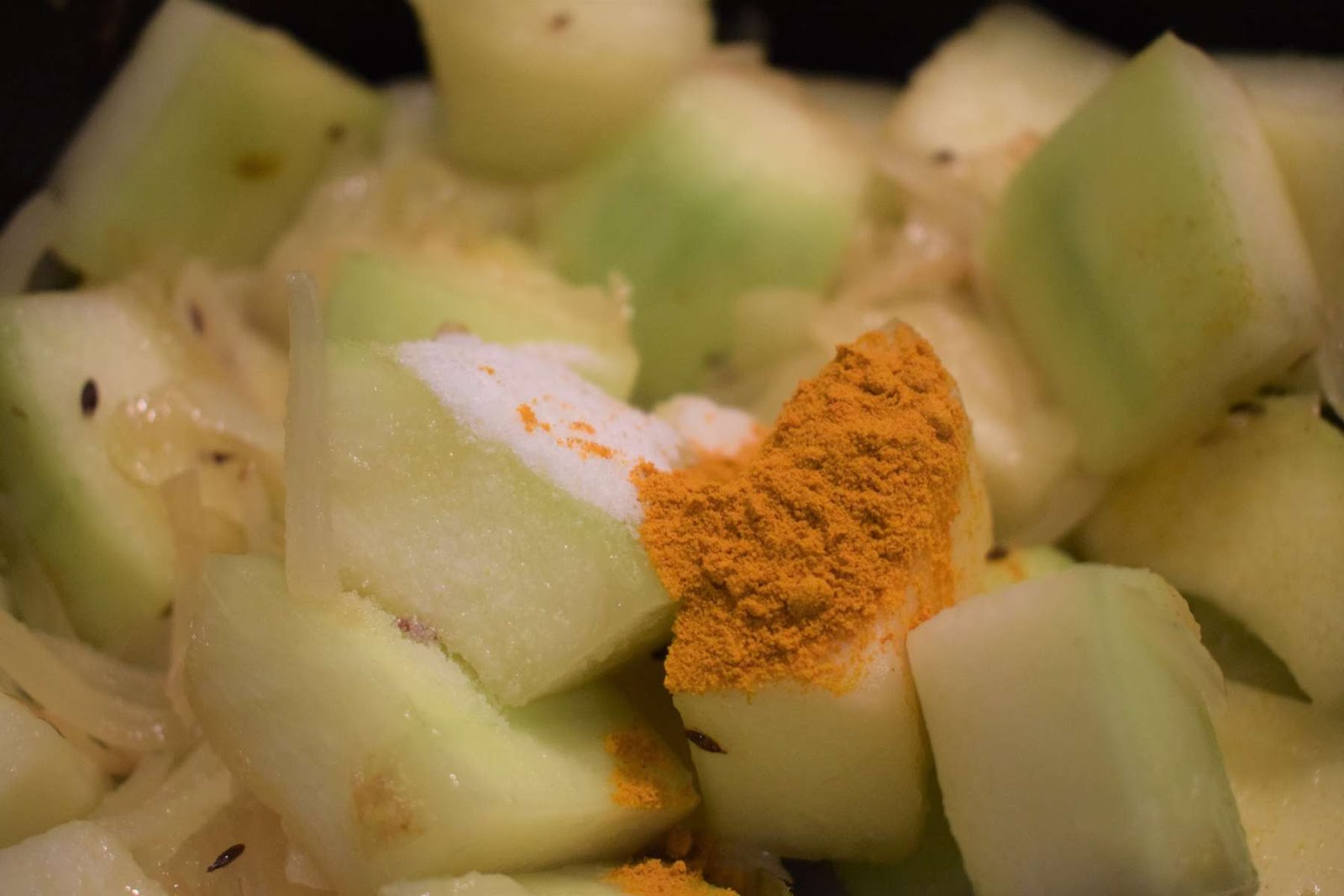 I have used Cumin seeds for the tempering of the dish. It gives a nice aroma to the dish. Then I have fried the sliced onions for some time and added Ginger-Garlic paste to cook it further. Marrow does not have any flavour on itself. So, each of these ingredients are equally important to flavour up the dish.