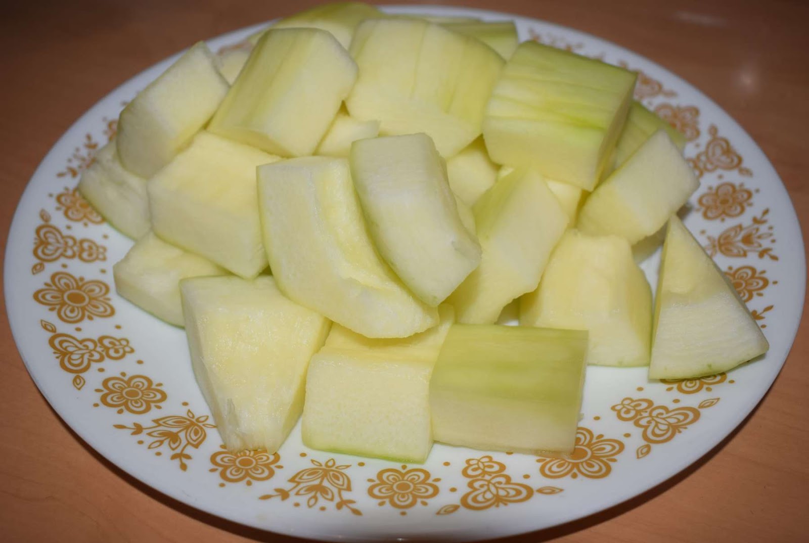 In this preparation, first, I have peeled and cut the Marrow in medium sized pieces for frying. Marrow has the tendency to become watery during the time of cooking and gets mashed easily. So, I did not prefer smaller pieces of it.
