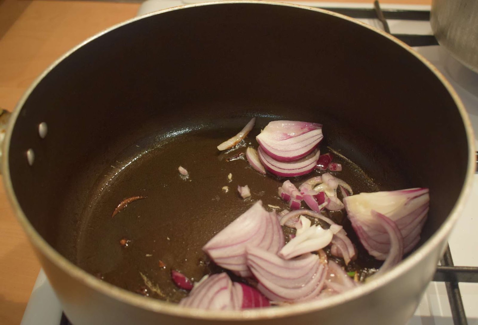- Add Onions and cook it for 2-3 minutes in medium high flame until it becomes translucent.
