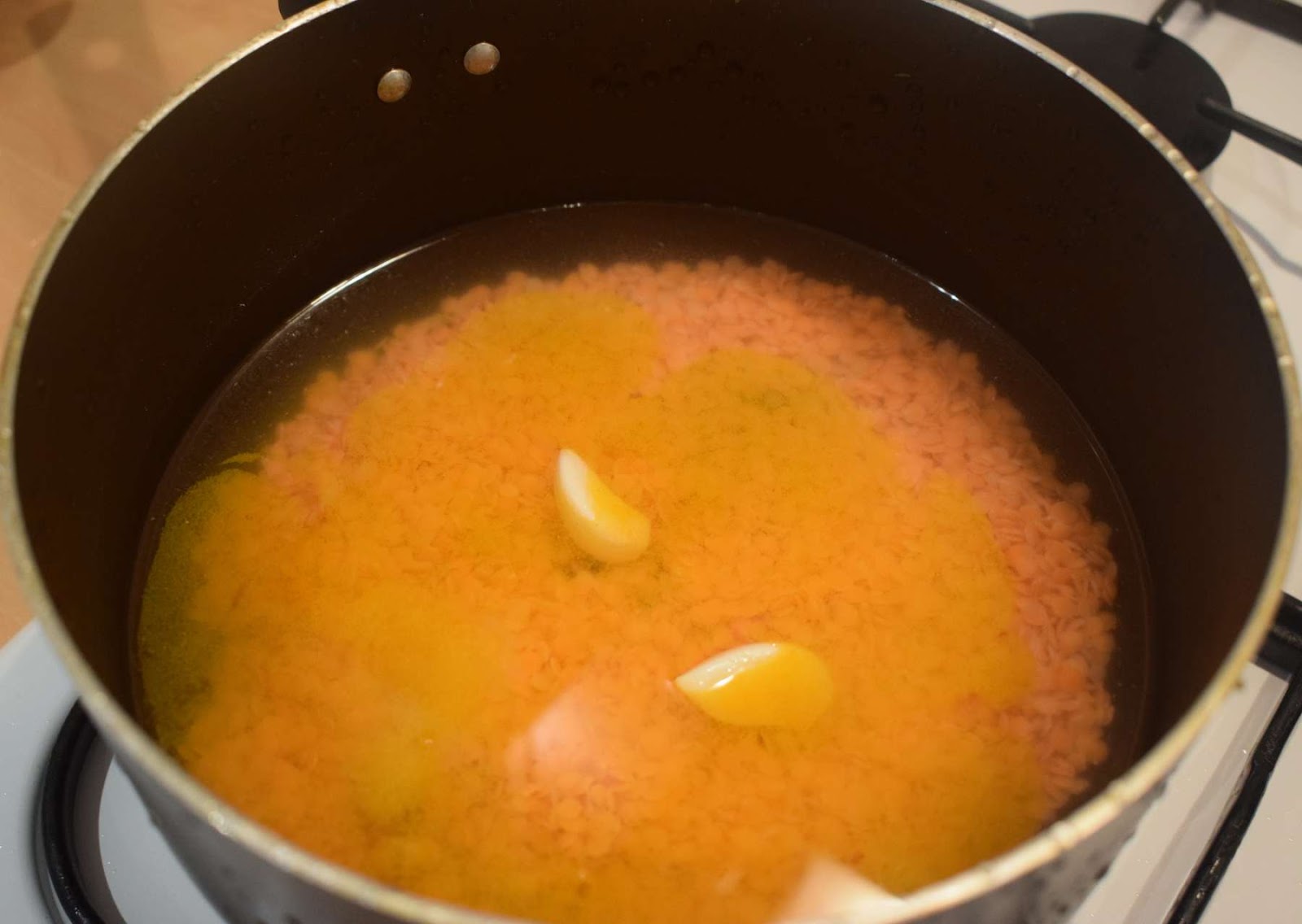 - Add water, Garlic and Turmeric powder into the pan and close the lid.