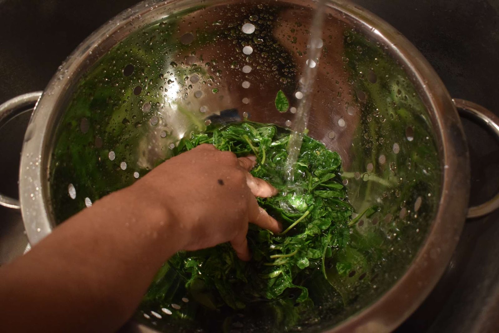 - Then I have taken the leaves in a colander and rinsed them thoroughly in running water.