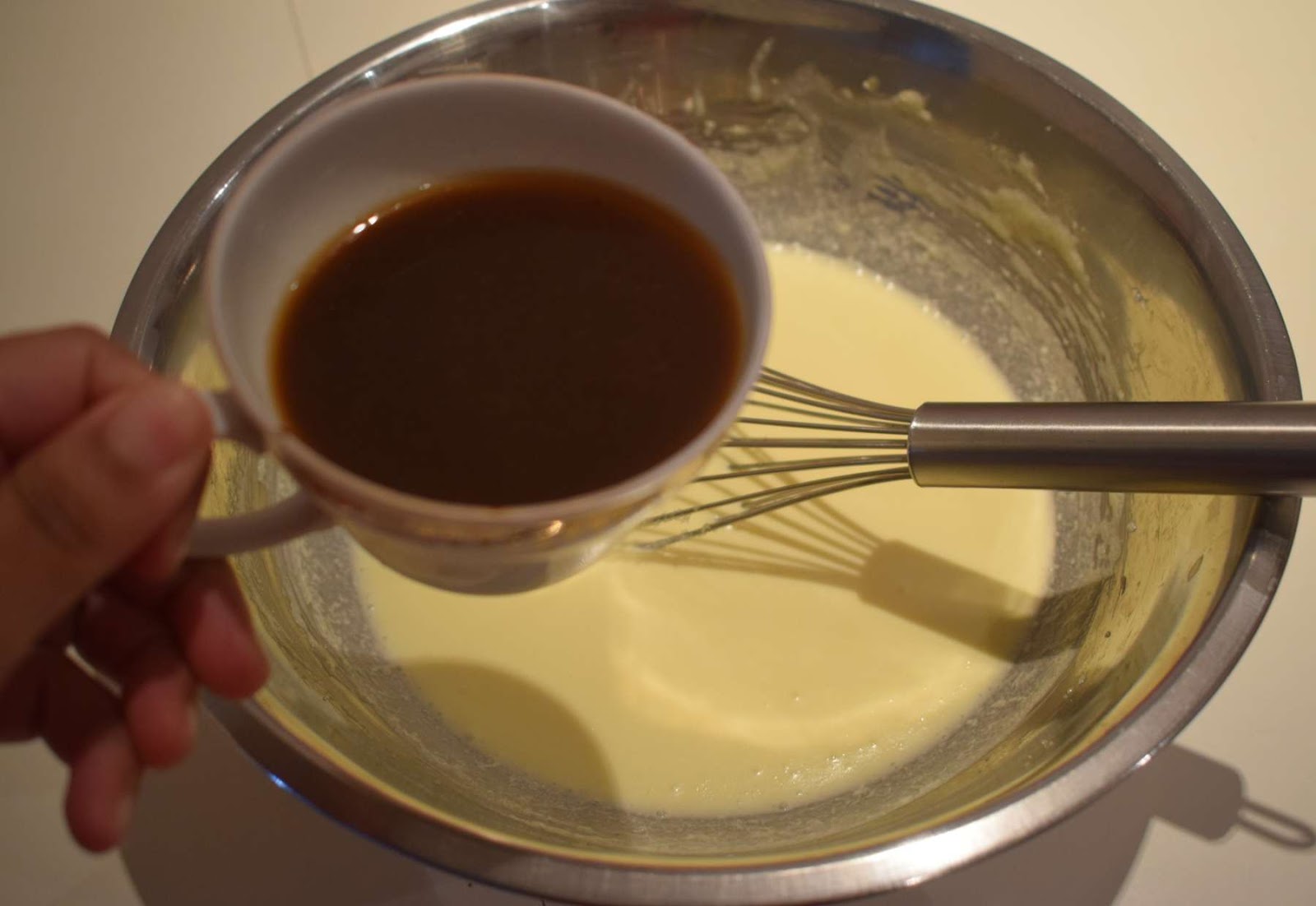 - Add hot black coffee into the mixture and give a quick mix with the whisker till the batter is even and smooth.